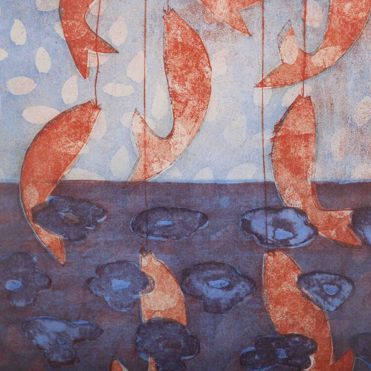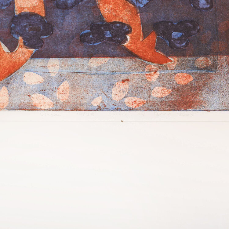 L. de Bree, Vissen, 2003. Ets in metalen lijst, oplage 10/25. Voorstelling van hangende rode vissen voor een blauwe achtergrond. Onderaan titel, daarnaast oplagenummer, signatuur en jaar. Conditie: goed, gebruikssporen aan lijst. Afmeting werk zonder lijst: 54 x 44 cm.