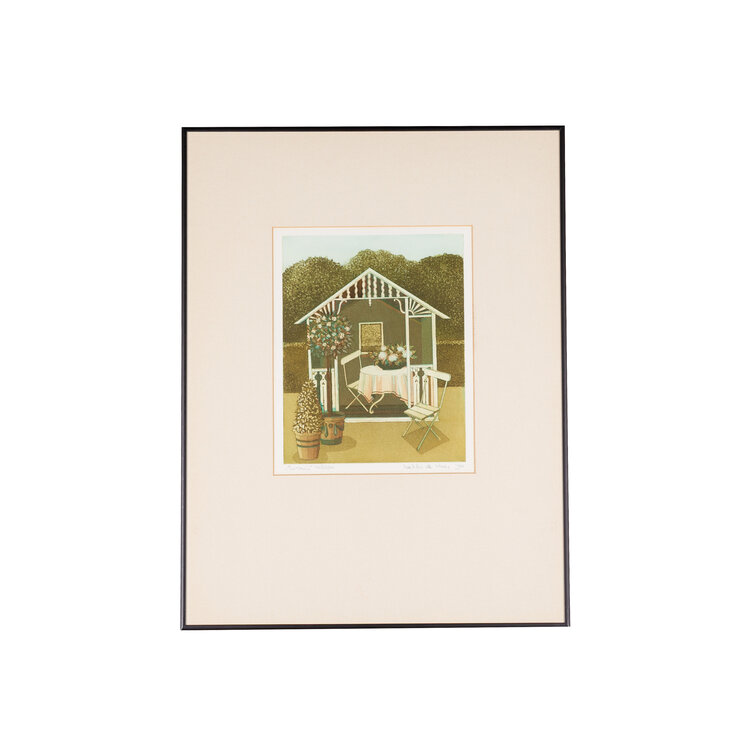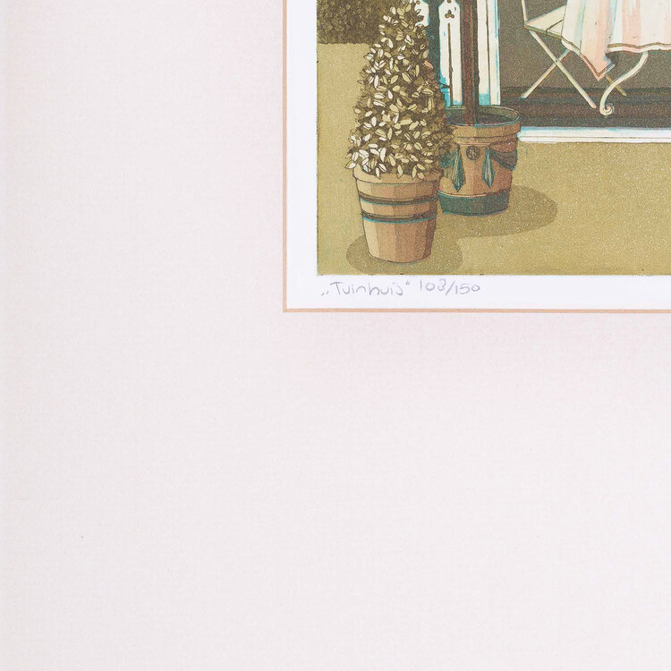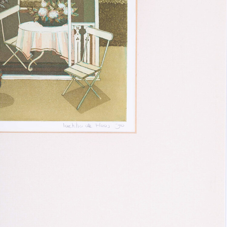 Laetitia de Haas, 'Tuinhuis', 1990. Kleurenets met passe-partout in zwart metalen lijst, oplage 108/150. Afbeelding van een tuinhuis met een tafel en twee stoelen in groen en roze. Rechtsonder signatuur. Conditie: passe-partout is verkleurd; gebruikssporen lijst. Afmeting lijst: 65,5 x 50,5 cm.