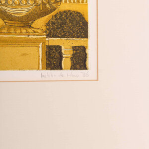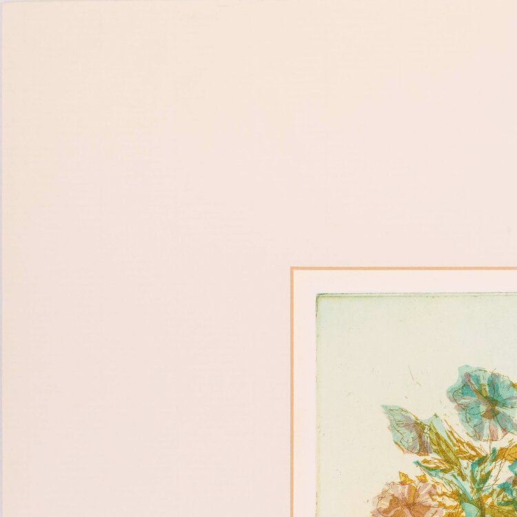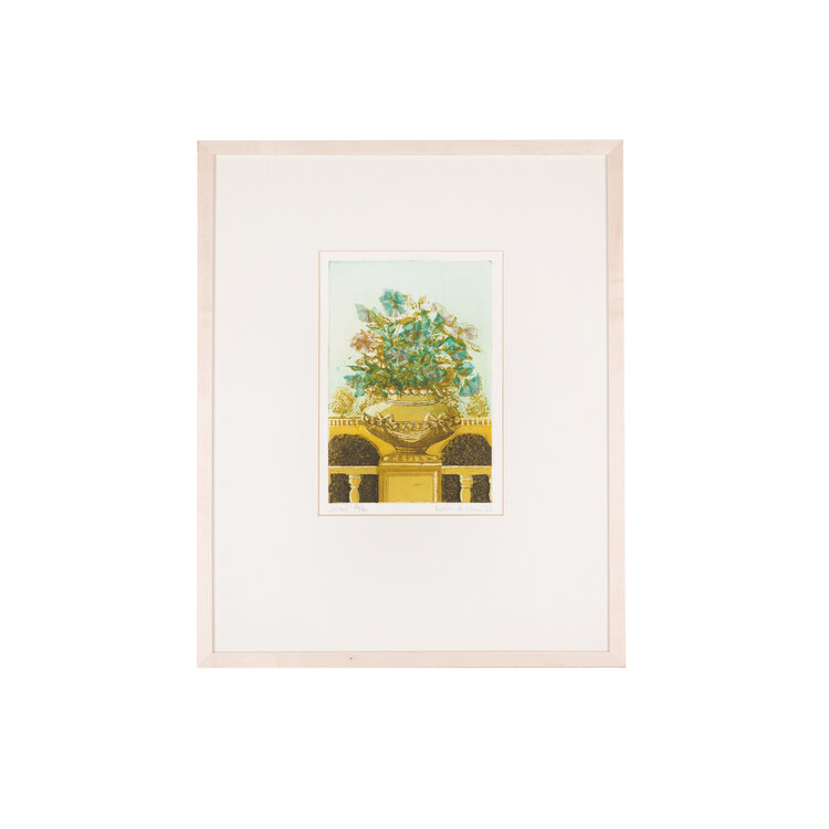 Laetitia de Haas, 'Kent', 1986. Ets op papier in blankhouten lijst, oplage 68/80. Afbeelding van een vaas blauwe en roze bloemen op een sokkel. Linksonder titel en oplagenummer, rechtsonder signatuur en jaar. Conditie: goed. Afmetingen lijst: 52 x 42 cm.