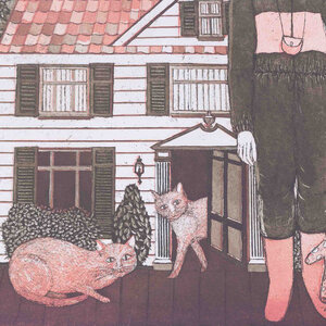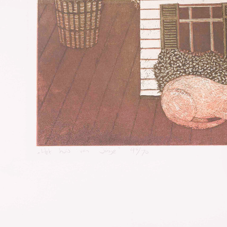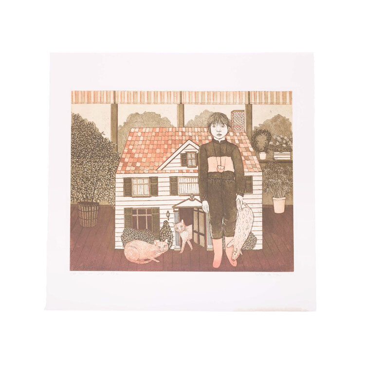 Laetitia de Haas, Het huis van Josje, 1981. Kleurenets op papier zonder lijst, oplage 46/70. Een meisje staat met haar knuffel en twee katten voor een speelhuisje op een veranda. De afbeelding is in rood- en groentinten. Linksonder titel en oplagenummer, rechtsonder signatuur en jaar. Conditie: het papier toont hier en daar gebruikssporen, aan de onderzijde vlekken. Afmetingen papier: 56 x 60 cm.