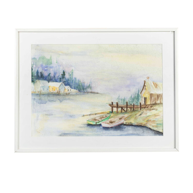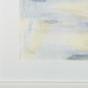 Lenie Kuijper- van Rooijen, Zonder titel, 2007. Aquarel op papier in wit metalen lijst. Landschap met op de voorgrond twee bootjes aan het water. Linksonder signatuur. Conditie: werk is in goede conditie, lijst toont gebruikssporen en rechtsboven een chipje in het glas. Afmetingen: werk 23 x 33 cm; lijst 31 x 41 cm.