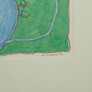 Leon Wildenburg, In het land van Eu, 2000. Gemengde techniek op papier in een metalen lijst. Kleurrijk landschap gezien vanaf de lucht, met huizen, bomen en vliegveld. In het midden van de voorstelling bevinden zich een meer en een menselijke figuur die bestaat uit een broek met daarop een hoofd dat een toren lijkt te dragen. Het werk is rechtsonder gesigneerd en gedateerd. Conditie: Het kunstwerk is in goede conditie, al toont de lijst sporen van gebruik. Afmetingen: beeldvlak 41 x 59 cm.