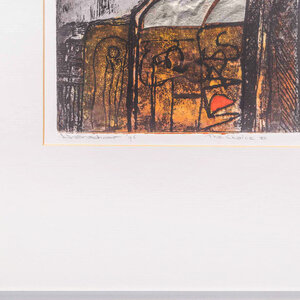 Lidia Verschoor, 'The choice II', 1995. Ets in metalen lijst, oplage 10/20. Abstracte compositie van een bruine vorm met daarin rode figuren, voor een grijze achtergrond. Signatuur linksonder. Conditie: werk is in goede conditie, lijst toont hier en daar gebruikssporen. Afmetingen incl. lijst: 66 x 51 cm; beeldvlak: 41 x 31 cm.