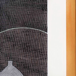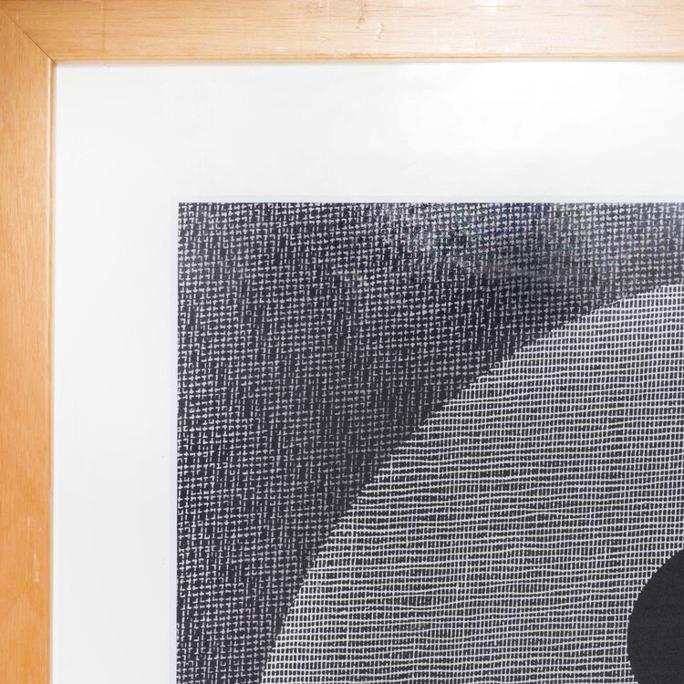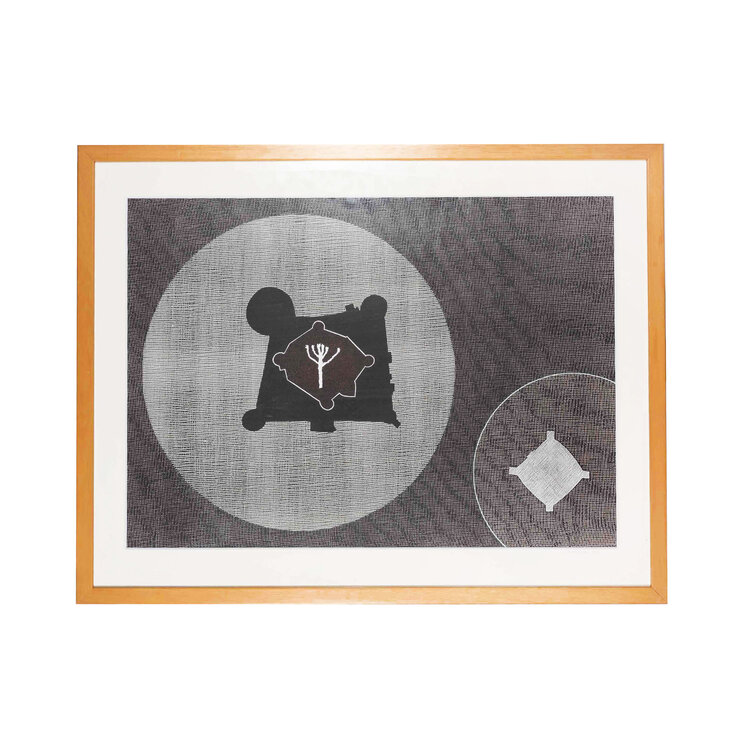 Liesbeth Peeters, 'Zonder Titel', 1998. Gemengde techniek op papier met passe-partout in houten lijst met kunststof plaat. Abstracte voorstelling van twee cirkels, met in de grote cirkel een boomstam met takken in zwart, grijs, wit en abrikoos. Signatuur rechtsonder. Conditie: kunststof plaat is vies, lijst vertoont gebruikssporen. Afmetingen incl lijst: ca 68 x 53 cm.