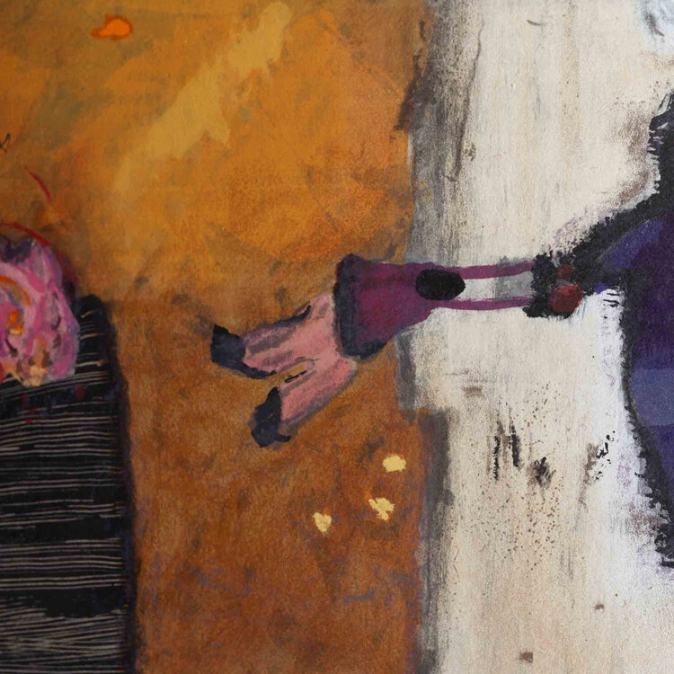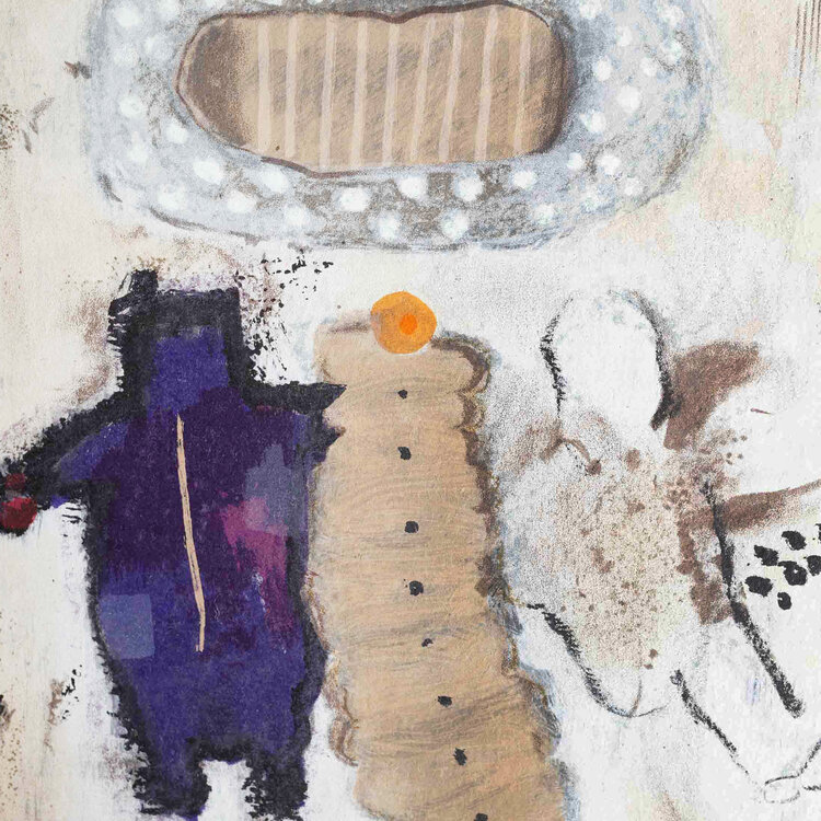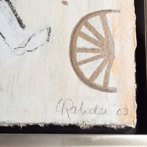 Liesbeth Rahder, Compositie I, 2003. Zeefdruk op papier op houten plaat in zilverkleurige baklijst, oplage van 150. Abstracte langwerpige compositie van twee vlakken met links een boeket en rechts vormen in bruin, paars en wit. Linksonder oplagenummer, rechtsonder signatuur en jaar. Kunstenares Liesbeth Rahder (geb. 1955) genoot haar opleiding aan de Rietveldacademie te Amsterdam. Haar werk is te herkennen aan gestructureerde kleurvlakken in een afwisselen kleurpalet. Rahder schildert zo veel mogelijk vanuit haar onderbewustzijn en laat het op haar doek gebeuren. Ze maakt vooral schilderijen maar is sinds kort ook bezig met sculptuur. Rahder heeft in verschillende galeries in Nederland en Spanje geëxposeerd. Conditie: goed, de lijst toont lichte gebruikssporen. Afmeting lijst: 41 x 106 cm.