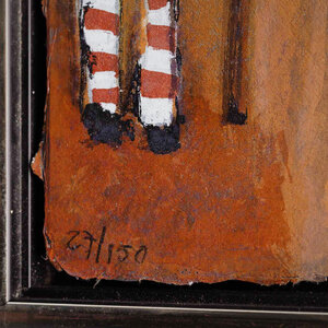 Liesbeth Rahder, Compositie II, 2003. Zeefdruk op papier op houten plaat in zilverkleurige baklijst, oplage van 150. Abstracte langwerpige compositie van drie vlakken met figuren in paars, bruint en blauw-tinten. Linksonder oplagenummer, rechtsonder signatuur en jaar. Kunstenares Liesbeth Rahder (geb. 1955) genoot haar opleiding aan de Rietveldacademie te Amsterdam. Haar werk is te herkennen aan gestructureerde kleurvlakken in een afwisselen kleurpalet. Rahder schildert zo veel mogelijk vanuit haar onderbewustzijn en laat het op haar doek gebeuren. Ze maakt vooral schilderijen maar is sinds kort ook bezig met sculptuur. Rahder heeft in verschillende galeries in Nederland en Spanje geëxposeerd. Conditie: goed, de lijst toont lichte gebruikssporen. Afmeting lijst: 41 x 106 cm.