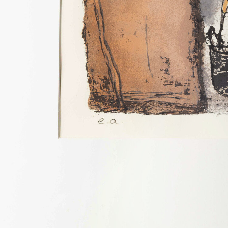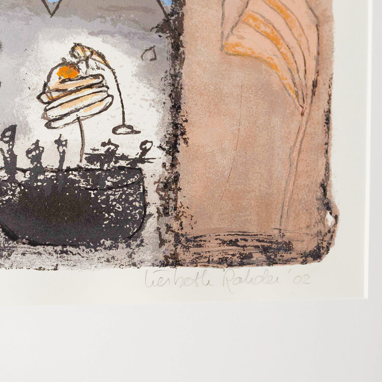 Liesbeth Rahder, Compositie, 2002. Zeefdruk op papier, oplage E.A.. Abstracte compositie van een boot met daarin verschillende figuren. Links en rechts twee figuren die aan het vissen zijn en daar tussen een dier in geel. Linksonder in potlood e.a., rechtsonder signatuur en jaar. Kunstenares Liesbeth Rahder (geb. 1955) genoot haar opleiding aan de Rietveldacademie te Amsterdam. Haar werk is te herkennen aan gestructureerde kleurvlakken in een afwisselen kleurpalet. Rahder schildert zo veel mogelijk vanuit haar onderbewustzijn en laat het op haar doek gebeuren. Ze maakt vooral schilderijen maar is sinds kort ook bezig met sculptuur. Rahder heeft in verschillende galeries in Nederland en Spanje geëxposeerd. Conditie: goed, de lijst toont lichte gebruikssporen. Afmeting lijst: 77 x 90 cm.