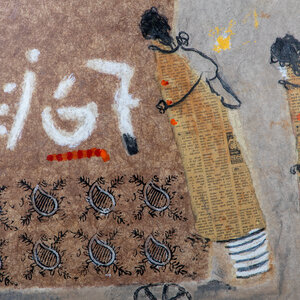 Liesbeth Rahder, From day to day I, jaartal onbekend. Zeefdruk op houten plaat in zilverkleurige baklijst, oplage van 90. Abstracte voorstelling van een wagen met daarnaast drie figuren. Linksonder oplagenummer, rechtsonder signatuur. Conditie: goed. Afmeting lijst: 75 x 105 cm.