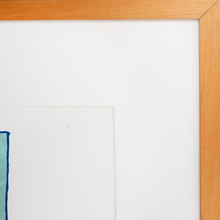 Lily Corver (Rotterdam, 1955), 'Vingers', 2000. Zeefdruk op papier in houten lijst, oplage 73/175. Abstracte compositie in bruin, beige en blauw. Signatuur rechtsonder. Afmetingen lijst: 78 x 83 cm, beeldvlak: 50 x 61 cm. Conditie: werk is in goede conditie, plastic plaat heeft twee krassen.