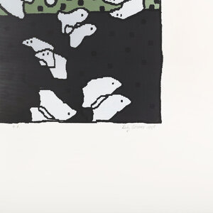 Lily Corver, Zonder titel, 1995. Zeefdruk op papier in metalen lijst, oplage 49/60. Abstracte compositie met witte vormen en zwarte stippen voor een deels groen en deels grijze achtergrond. Linksonder oplagenummer, rechtsonder signatuur en jaar. Conditie: goed, gebruikssporen aan lijst. Afmeting werk zonder lijst: 31 x 29 cm; incl. lijst: 64 x 49 cm.