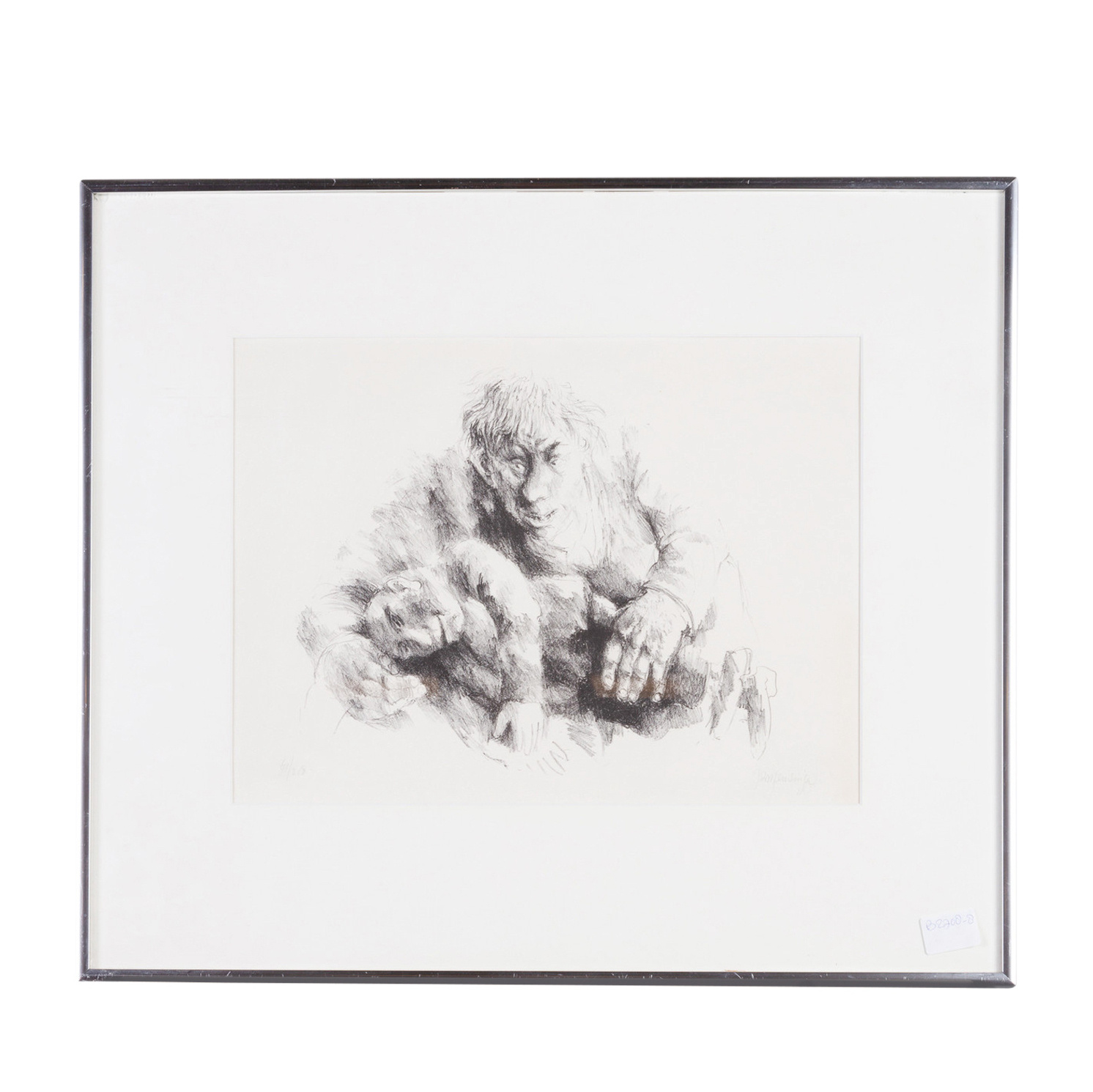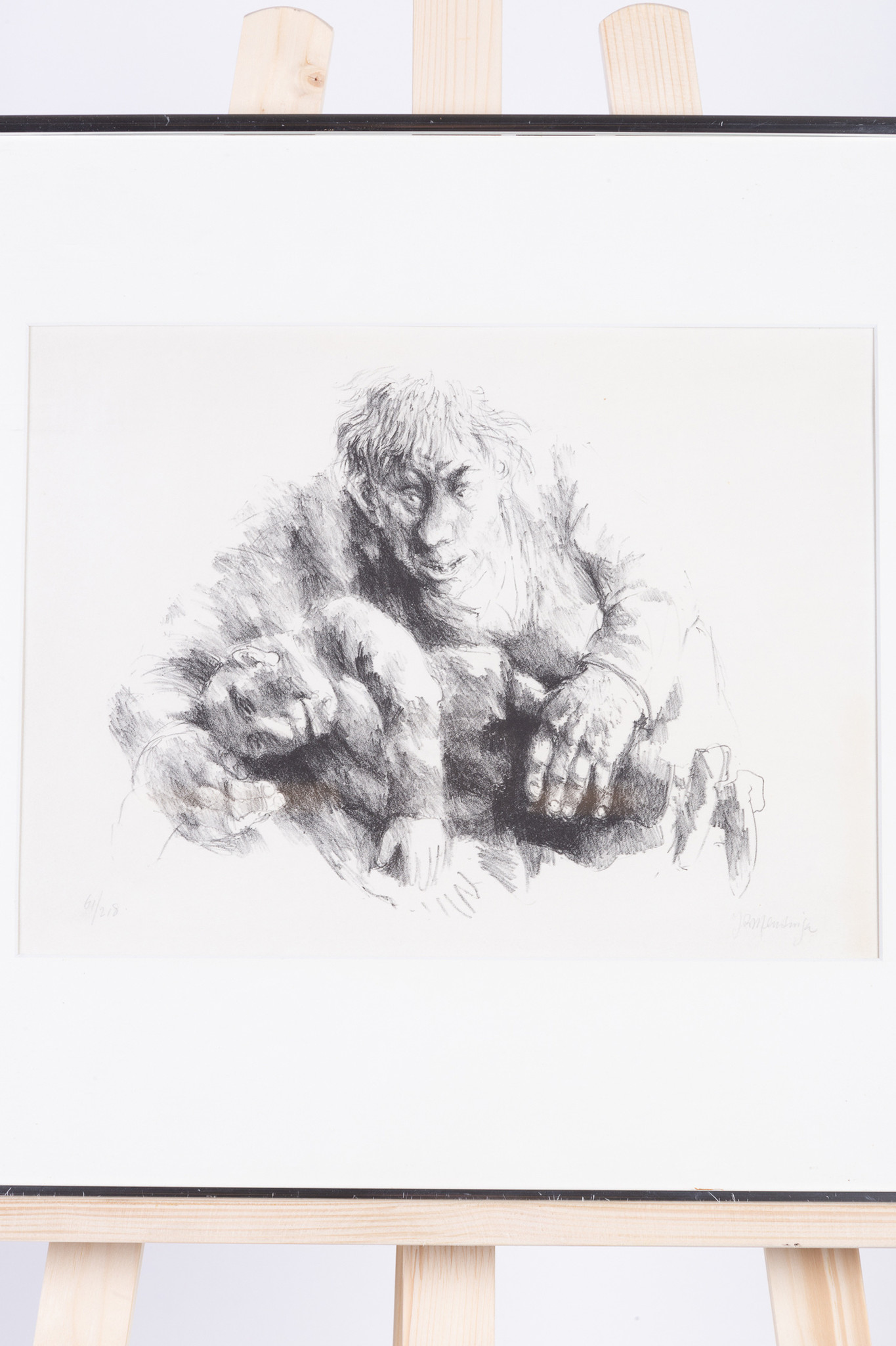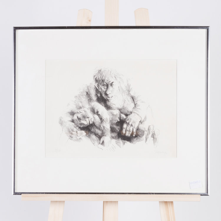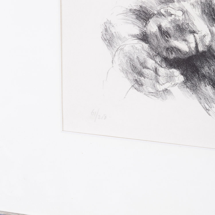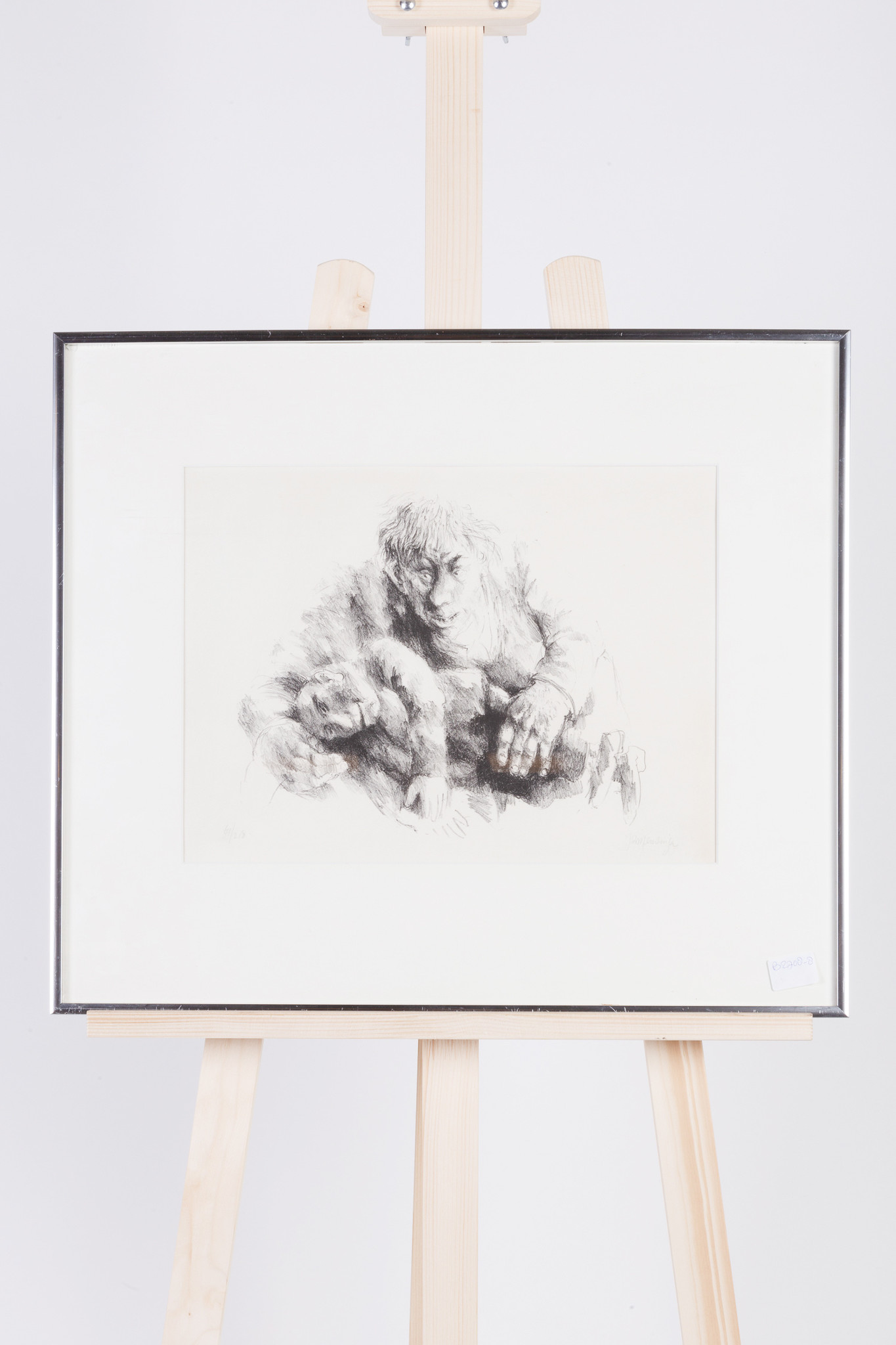 Lithografie van een man die een figuur in zijn armen houdt. Het werk is vervaardigd met losse toets en zichtbare arceringen, wat de indruk geeft dat de kunstenaar vlot heeft gewerkt. Het werk is ingelijst achter glas met passe-partout. Jan Mensinga (1924-1998) was een Nederlandse kunstenaar die veel in grafiek werkte. Zijn werk bevindt zich in de collecties van grote musea, zoals het Rijksmuseum en het Centraal Museum Utrecht. Datering: ca. 1950-1998. Conditie: het werk is in goede conditie. Lijst heeft enige gebruikssporen. Afmetingen: lijst ca. 47.5 x 55 cm, werk ca. 27.5 x 37 cm.