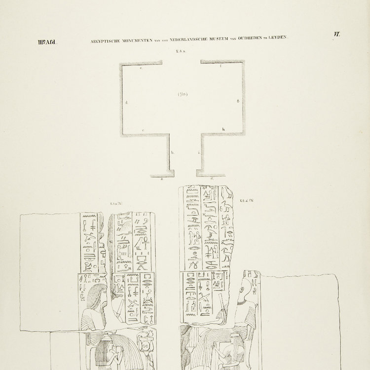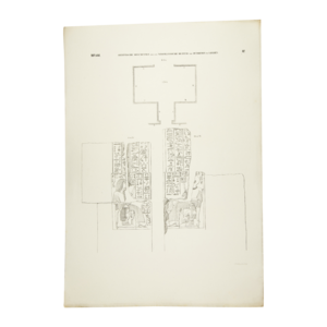Lithografie gemaakt door Tiemen Hooiberg voor de eerste complete catalogus van de Egyptische collectie van het Rijksmuseum van Oudheden. Getekend zijn een plattegrond en een aantal reliëfs op de kapel van Paätenemheb. Hij was schenker van de koning in het paleis van Memphis, 18de dynastie. Datering: 1840. Conditie: lichte tekenen van ouderdom aan de randen. Afmetingen: ca. 37,5 x 54 cm.