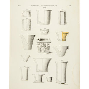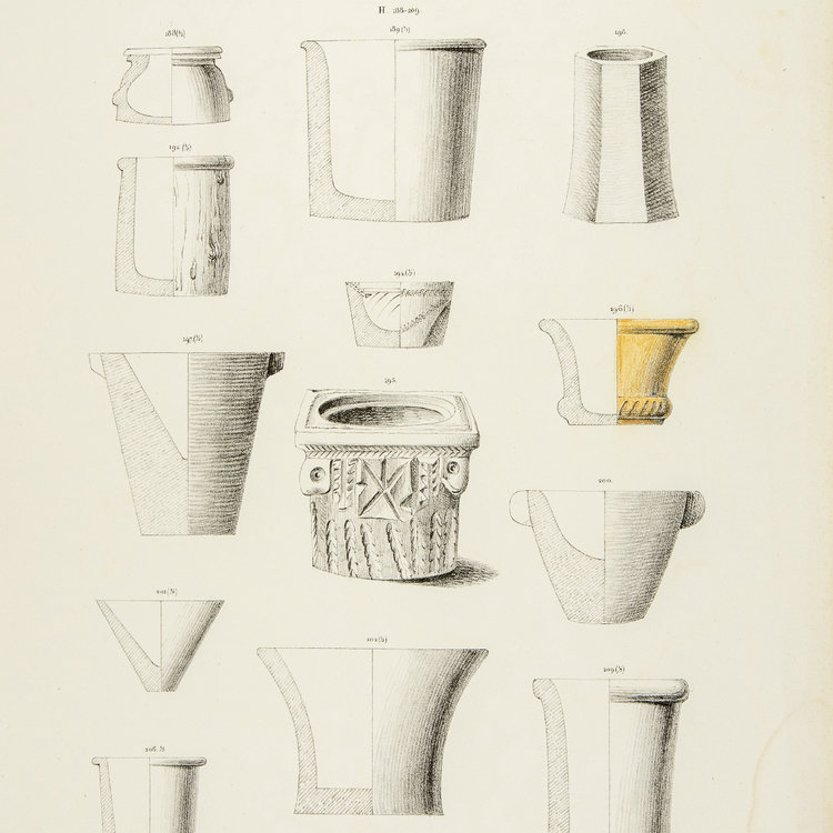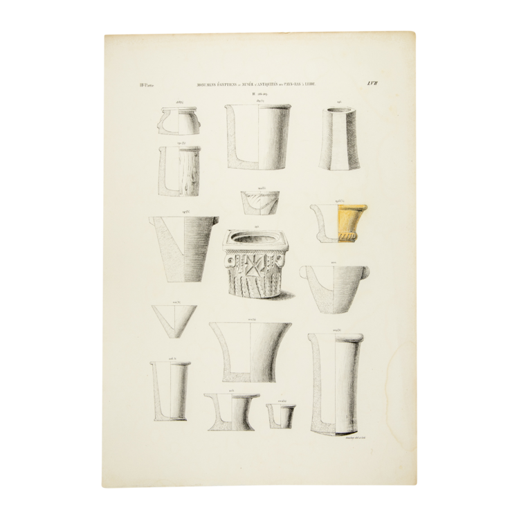 Litho van tekeningen gemaakt door Tiemen Hooiberg voor de eerste complete catalogus van de Egyptische collectie van het Rijksmuseum van Oudheden. Afgebeeld zijn potjes en kohlpotjes van verschillende formaten, waarvan één is ingekleurd in oranje-geel. Alle objecten zijn te bekijken in de collectiedatabase van de site van het museum. Datering: 1840. Conditie: tekenen van ouderdom aan de randen van het vel. Lichte vlek van waterschade te zien rechtsonder. Afmetingen: ca. 37 x 54 cm.