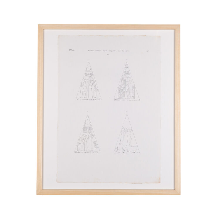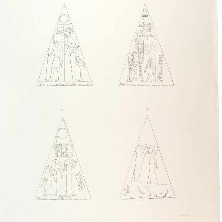 Litho gemaakt door Tiemen Hooiberg voor de eerste complete catalogus van de Egyptische collectie van het Rijksmuseum van Oudheden. Getekend zijn de reliëfs van de vier zijdes van de Piramidion van Ptahemwia. Aan de voorkant is de overledene Ptahemwia te zien met daarboven de god Anubis. Zijn vrouw en kinderen zijn afgebeeld aan de rechterzijde en aan de achterkant zijn de goden Ra-Horakhte en Osiris te zien. Datering: 1840. De litho zit in een blankhouten lijst. Conditie: lichte tekenen van ouderdom aan de randen. Afmetingen: lijst ca. 62,5 x 52,5 cm; papier ca. 37,5 x 54 cm.
