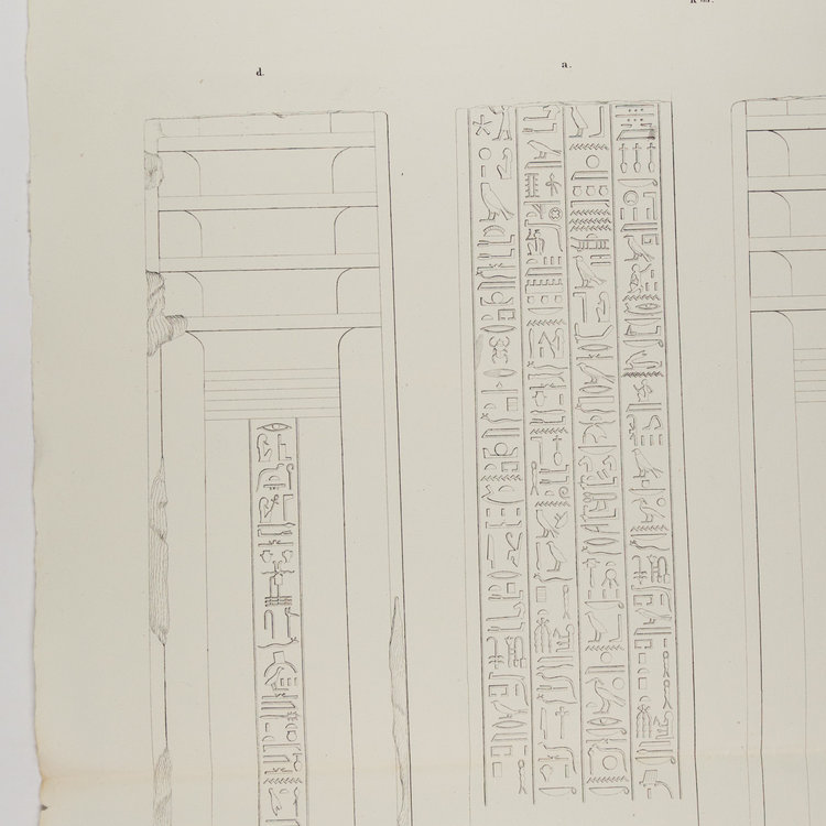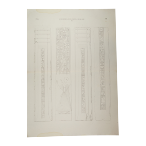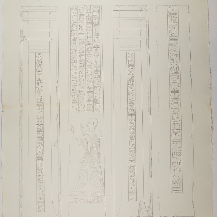 Lithografie gemaakt door Tiemen Hooiberg voor de eerste complete catalogus van de Egyptische collectie van het Rijksmuseum van Oudheden. Getekend zijn de reliëfs op de pijlers uit het graf van Ptahmes. Hij was opperrentmeester in de tempel van Ptah, de stadsgod van Memphis. Datering: 1840. Conditie: de prent is in het middel dubbel gevouwen en toont lichte tekenen van ouderdom. Enkele sporen van waterschade en vlekjes langs de randen. Afmetingen: ca. 54,5 cm x 75,5 cm.