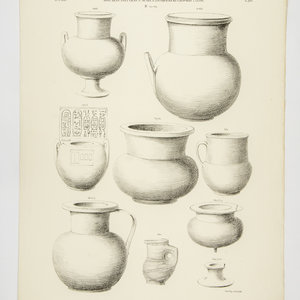 Set van twee litho's van tekeningen gemaakt door Tiemen Hooiberg voor de eerste complete catalogus van de Egyptische collectie van het Rijksmuseum van Oudheden. Afgebeeld zijn verschillende kruiken en vazen van verschillende formaten. Alle stukken zijn te bekijken in de collectiedatabase van de site van het museum. Datering: 1840. Conditie: lichte tekenen van ouderdom aan de randen. Afmetingen per litho: ca. 37,5 x 54 cm.
