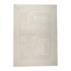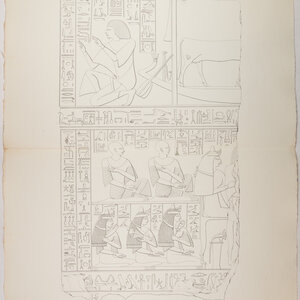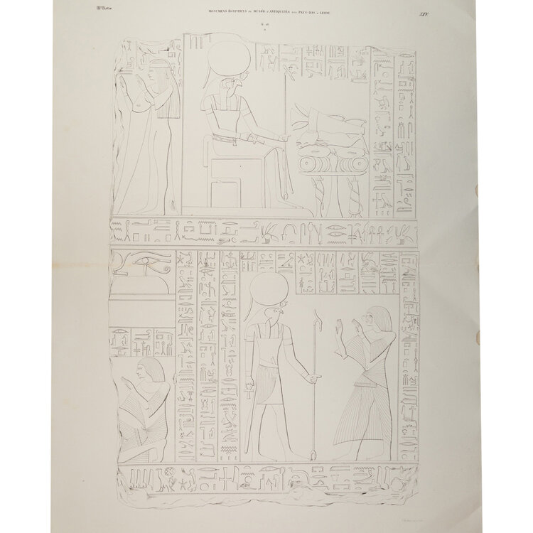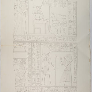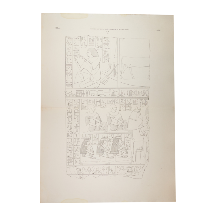 Lithografieën van tekeningen gemaakt door Tiemen Hooiberg voor de eerste complete catalogus van de Egyptische collectie van het Rijksmuseum van Oudheden. Afgebeeld zijn tekeningen op het reliëf van Ptahmes. Hij was opperrentmeester in de tempel van Ptah, de stadsgod van Memphis. Het reliëf is te bekijken in de collectiedatabase van de site van het museum. Datering: 1840. Conditie: lichte tekenen van ouderdom aan de randen, de prenten is in het midden dubbel gevouwen. Lichte sporen van waterschade. Afmetingen: ca. 54,5 cm x 75,5 cm.