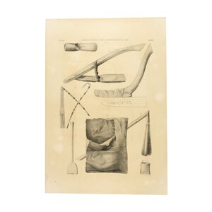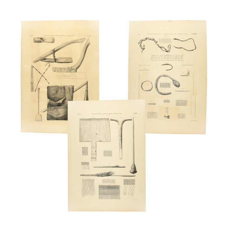 Set van drie litho's gemaakt door Tiemen Hooiberg voor de eerste complete catalogus van de Egyptische collectie van het Rijksmuseum van Oudheden. Litho's met onderwerpen als weefkunst en gereedschap. Alle objecten zijn te bekijken in de collectiedatabase van de site van het museum. Van 1830 tot 1889 werkte Tiemen Hooiberg in het Rijksmuseum van Oudheden te Leiden als opgravingtekenaar, lithograaf en amanuensis. Datering: 1840. Conditie: De prenten vertonen sporen van ouderdom, zoals verkleuring, vlekken en beschadigingen, mn aan de randen. Lichte afdruk van een andere litho zichtbaar. Afmetingen: ca. 54 x 37 cm.