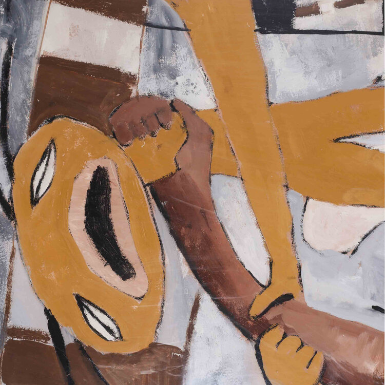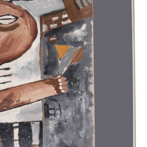 L.J. J. Lie A Fo, zonder titel, jaartal onbekend. Geabstraheerd figuren in worsteling, waar de een door de ander word opgegeten. Gouache. Afmetingen: 75 x 87 cm Conditie: Plexiglas heeft krassen en beschadigingen. Lijst toont sporen van gebruik.