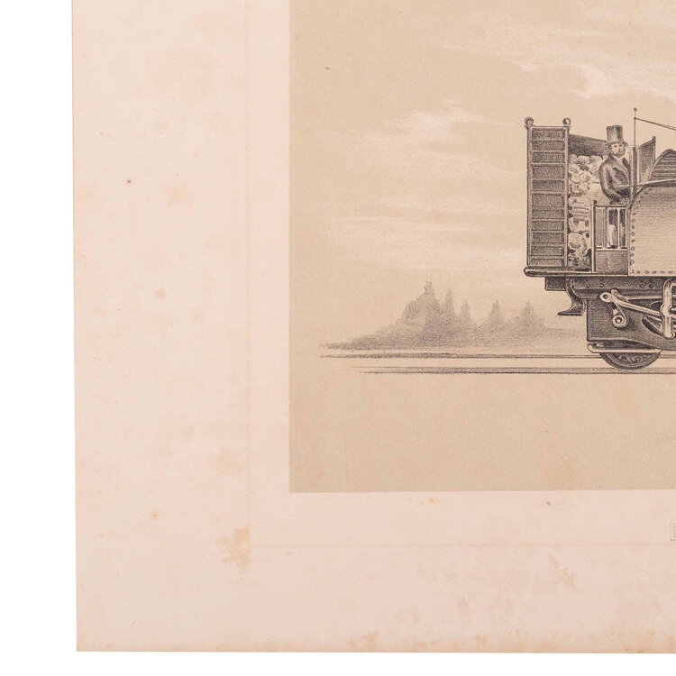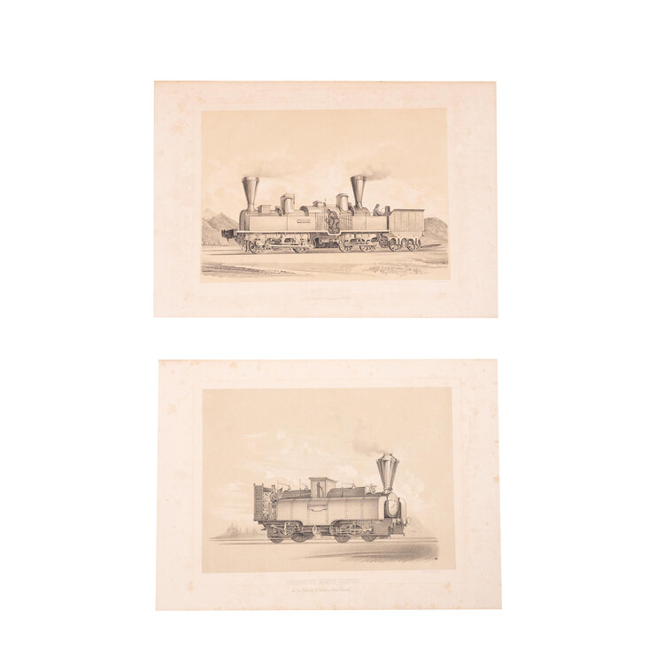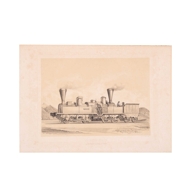 Locomotieven van de Semmeringspoorlijn in Oostenrijk: 'Lokomotive Seraing aus der Fabrik Cóckerills in Belgien'. De Seraing stoomlocomotief was een goederenlocomotief. Ze werd gebouwd door de locomotieffabriek Cockerill in Seraing (België); 'Lokomotive Wiener-Neustadt aus der Fabrik des H. Gunther in Wiener-Neustadt'. Ze werd gebouwd door de Wiener Neustädter Lokomotivfabrik in het Oostenrijks-Hongaarse Rijk. Litho's van J. Rauh. Datering: circa 1853. Conditie: De prenten hebben sporen van ouderdom. Verkleuring, vlekken en kleine beschadigingen aan de randen. Afmetingen van papier prenten: ca. 28,5 x 41 cm.