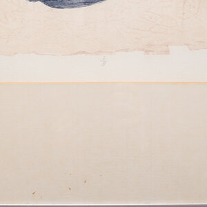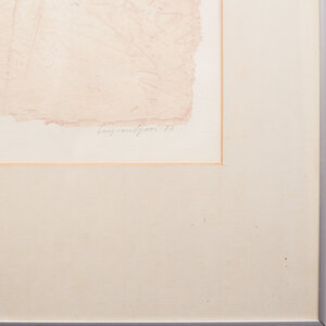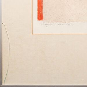 Loes van Goor (Zwolle, 1923), 'Compositie met teken'. Ets oplage 2/8, in een metalen lijst met passe-partout. Abstracte compositie van vlakken en vormen in de kleuren groen, zalmroze, donkergrijs en rood. Signatuur rechtsonder. Datering: 1986. Conditie: linksboven vouw in papier, linksonder barst in glas. Afmetingen lijst: 90,5 x 70,5 cm; beeldvlak: 58 x 49 cm.