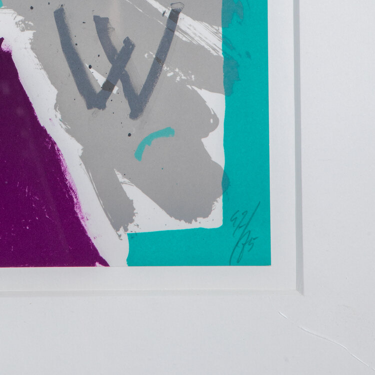 Luuk de Weert, Sugerbows & cheeks, jaartal onbekend. Zeefdruk op papier in metalen lijst, oplage 42/75. Abstractie compositie in grijs, met rode, turqoise en paarse accenten. Linksonder signatuur, rechtsonder oplagenummer. Conditie: goed, lichtte gebruikssporen aan lijst. Afmeting: 81,5 x 66 cm.