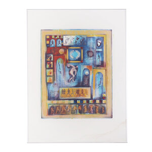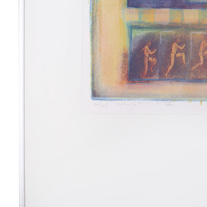 M. Aulman, Olympia I, 2003. Litho in metalen lijst, oplage 10/25. Kleurrijke compositie met diverse sporten van de Olympische spelen uit de Griekse Oudheid afgebeeld. Linksonder oplagenummer en titel, rechtsonder signatuur en jaar. Conditie: gebruikssporen aan lijst en rechtsonder vlek op passe-partout. Afmeting lijst: 84 x 64 cm.