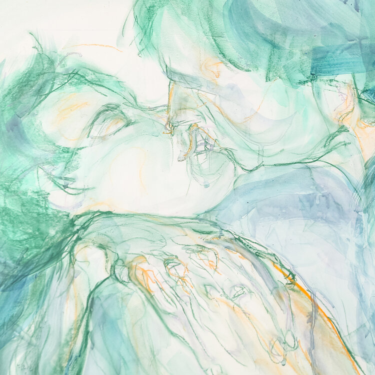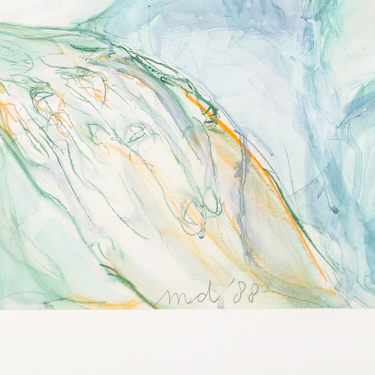 M. Duran, Paartje, 1988. Aquarel in houten lijst. Illustratie van twee zoenende mensen in blauw-groen met oranje accenten. Signatuur en jaar onderaan. Conditie: goed, gebruikssporen aan lijst. Afmeting werk zonder lijst: 38 x 48 cm.