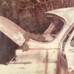 M. Koppen, Aronde, 1985. Kleurenfoto in zwarte lijst. Foto van een autowrak begroeid met sedum. Conditie: gebruikssporen aan lijst. Afmeting foto zonder lijst: 39 x 49 cm.