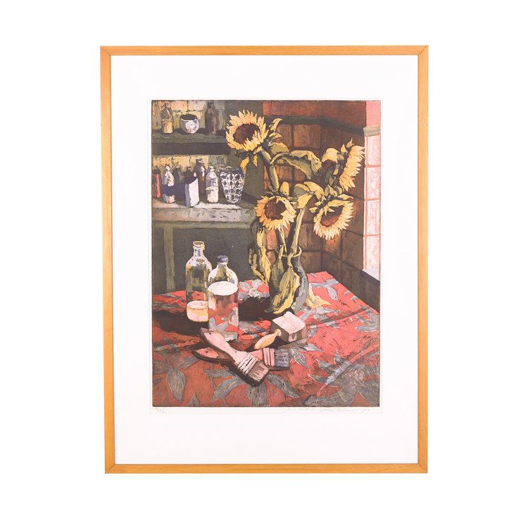 M. Schellekens, Zonnebloemen, 1994. Kleurenets in houten lijst, oplage 39/65. Stilleven met vaas zonnebloemen, twee flessen en kwasten op tafel met rood tafelkleed. Linksonder oplagenummer, rechtsonder signatuur en jaar. Conditie: goed, gebruikssporen aan lijst en glas bovenin zit een beetje los. Afmeting werk zonder lijst: 60 x 44 cm.