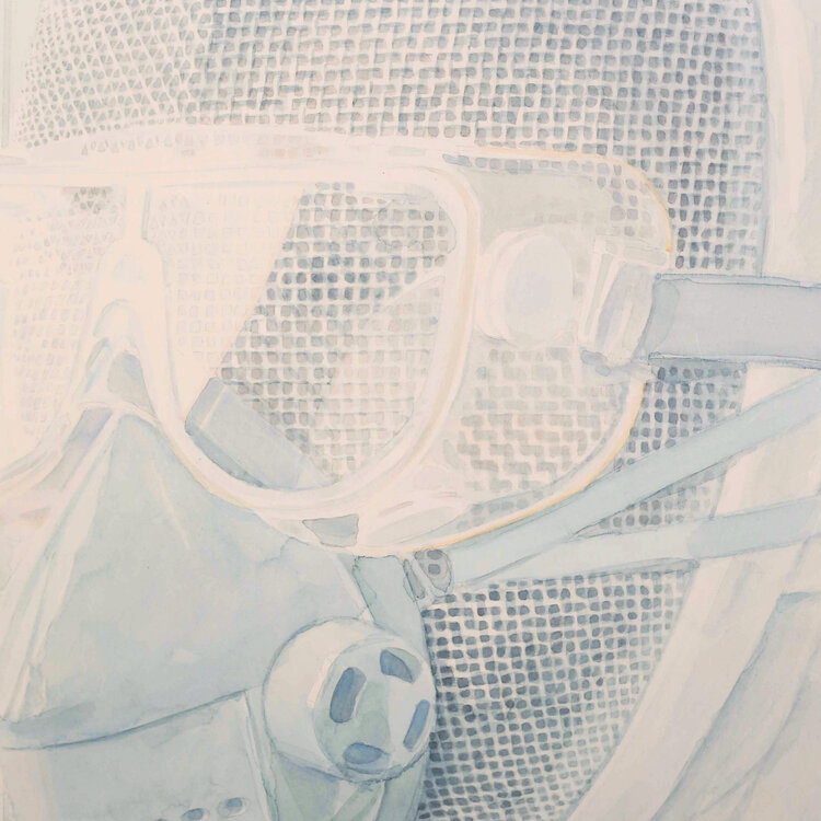 Maarten van Dreven, Gazen masker 3/4, 1979. Aquarel op papier in plexiglas omlijsting. Portret van persoon in scherm-outfit met veiligheidsbril en gasmasker voor een achtergrond van witte tegels. Rechtsonder signatuur en jaar. Conditie: lichte gebruikssporen. Afmeting: 104 x 74 cm.