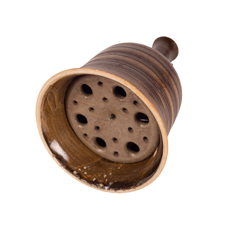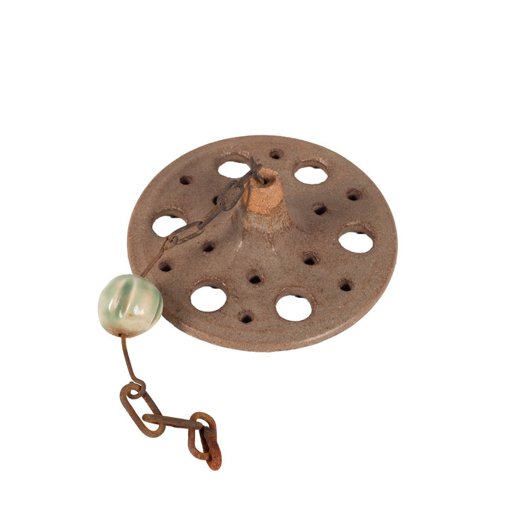 Marianna Franken, Bruine keramieken klok/bel met klepel, 1965. De bel is bruin geglazuurd en heeft een geribbelde decoratie. De klepel zit er los bij. Marianna Virginia Franken (Amsterdam, 2 februari 1928 - Laren, 15 februari 2025) heeft in 1965 een keramieken miniklokkenspel gemaakt voor in de buitenlucht. Het klokkenspel bevatte dertig klokken, opgehangen aan een stalen constructie. De keramieken klepels sloegen bij wind tegen de klokken aan waarbij er klanken ontstonden. Conditie: roest aan de ketting van de klepel. Afmetingen: ca 22 x Ø 14 cm.