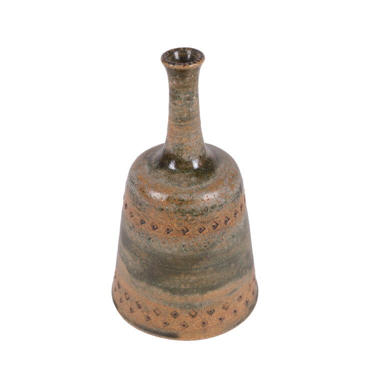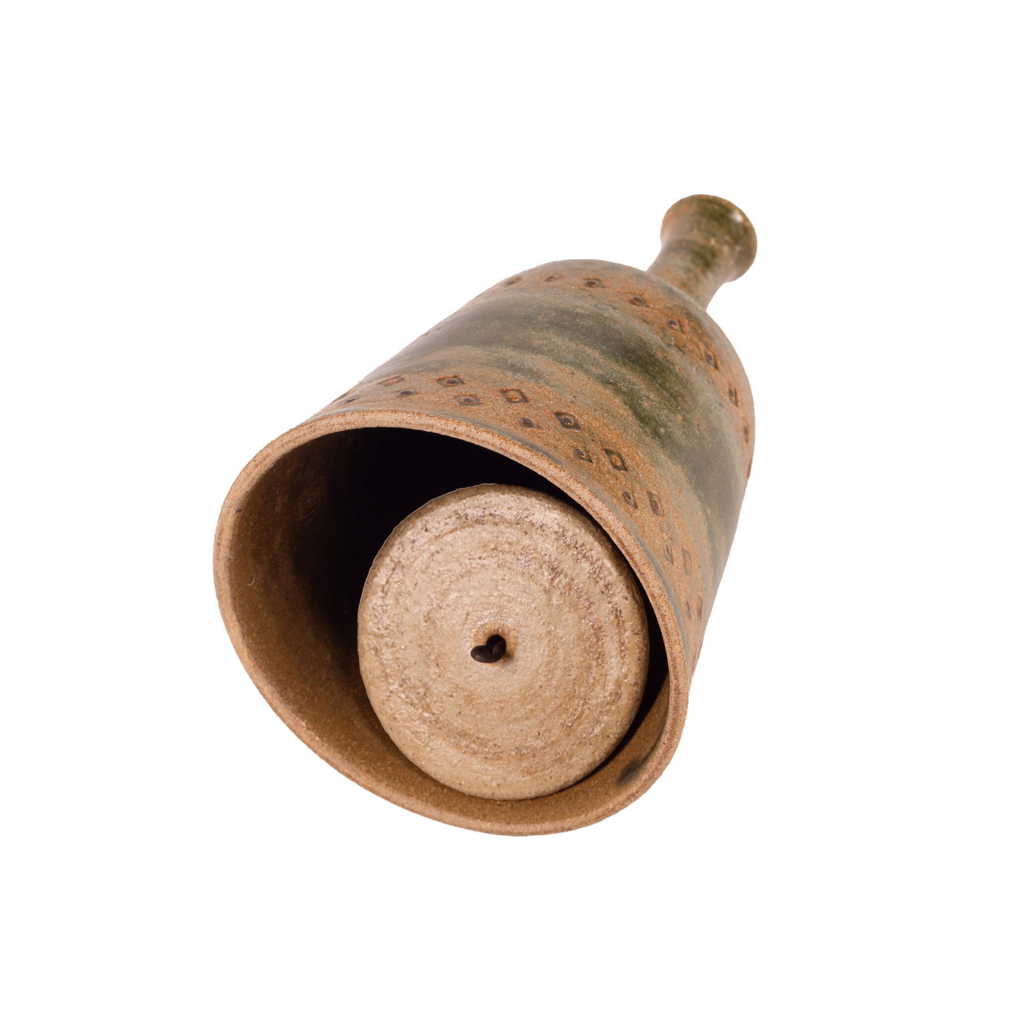 Marianna Franken, Groen-bruine keramieken klok/bel met klepel, 1965. De geglazuurde bel heeft verschillende groen- en bruintinten en is gedecoreerd met reliëfpatronen. De klepel zit er los bij. Marianna Virginia Franken (Amsterdam, 2 februari 1928 - Laren, 15 februari 2025) heeft in 1965 een keramieken miniklokkenspel gemaakt voor in de buitenlucht. Het klokkenspel bevatte dertig klokken, opgehangen aan een stalen constructie. De keramieken klepels sloegen bij wind tegen de klokken aan waarbij er klanken ontstonden. Conditie: roest aan de ketting van de klepel. Afmetingen: ca 20 cm hoog, met een diameter van ca 12 cm.