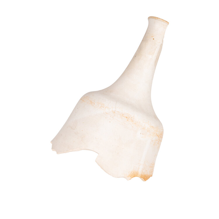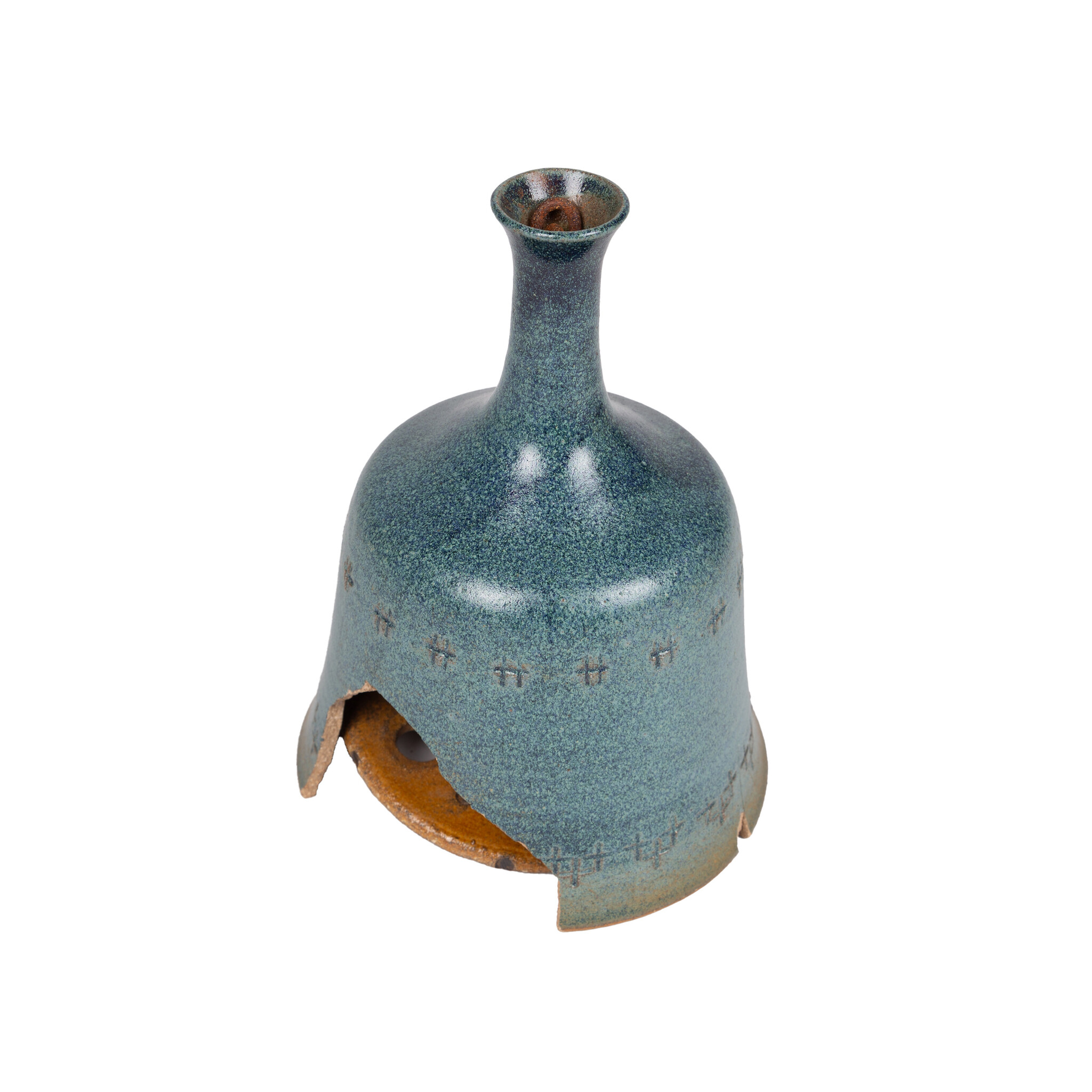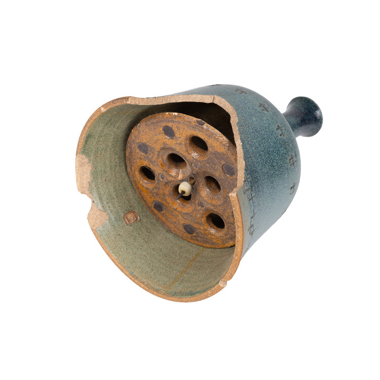 Marianna Franken, Set met kapotte klokken en onderdelen, 1965. Een blauwe geglazuurde keramieken klok/bel met klepel, gedecoreerd met reliëfpatronen. Aan de binnenkant hangt een keramieken klepel aan een metalen ketting, die aan de bovenkant van het handvat naar buiten komt; Drie delen van klokken in bruin, groen en wit; een kapotte klepel. Marianna Virginia Franken (Amsterdam, 2 februari 1928 - Laren, 15 februari 2025) heeft in 1965 een keramieken miniklokkenspel gemaakt voor in de buitenlucht. Het klokkenspel bevatte dertig klokken, opgehangen aan een stalen constructie. De keramieken klepels sloegen bij wind tegen de klokken aan waarbij er klanken ontstonden. Conditie: aan de onderkant van de blauwe klok zijn stukken afgebroken; roest aan de kettingen van de klepel. Afmetingen klok: ca 14,5 x Ø 21 cm.
