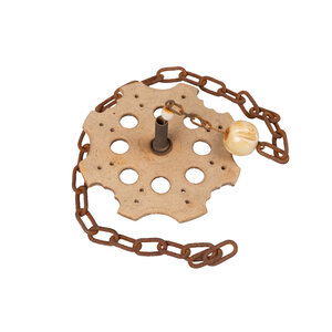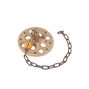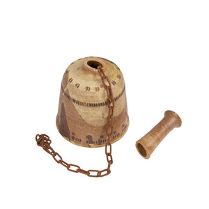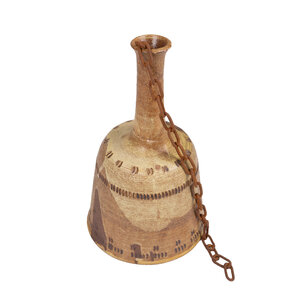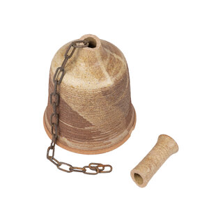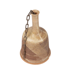 Marianna Franken, Twee bruine keramieken klokken/bellen met klepel, 1965. De geglazuurde bellen hebben verschillende bruintinten en zijn gedecoreerd met reliëfpatronen. Aan de binnenkant hangt een keramieken klepel aan een metalen ketting, die aan de bovenkant van het handvat naar buiten komt. Marianna Virginia Franken (Amsterdam, 2 februari 1928 - Laren, 15 februari 2025) heeft in 1965 een keramieken miniklokkenspel gemaakt voor in de buitenlucht. Het klokkenspel bevatte dertig klokken, opgehangen aan een stalen constructie. De keramieken klepels sloegen bij wind tegen de klokken aan waarbij er klanken ontstonden. Conditie: bij beide bellen is het handvat afgebroken, beschadigingen aan de onderrand, roest aan de ketting van de klepel. Afmetingen: ca 23 x Ø 13 cm; 27 x Ø 16 cm.