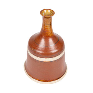 Marianna Franken, Twee keramieken klokken/bellen, 1965. De bellen hebben een handvat. Ze zijn bruin en roodbruin geglazuurd. Tweekleurig en met een geribbelde decoratie. Marianna Virginia Franken (Amsterdam, 2 februari 1928 - Laren, 15 februari 2025) heeft in 1965 een keramieken miniklokkenspel gemaakt voor in de buitenlucht. Het klokkenspel bevatte dertig klokken, opgehangen aan een stalen constructie. De keramieken klepels sloegen bij wind tegen de klokken aan waarbij er klanken ontstonden. Conditie: kleine beschadigingen aan de onderrand, de klepel ontbreekt. Afmetingen: ca 23 x Ø 15 cm; 24 x Ø 16,5 cm.
