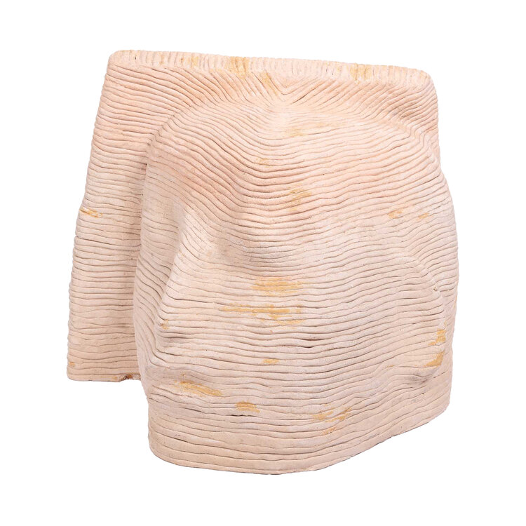 Marina van der Kooi (Amsterdam, 1951), 'Leunend hoofd', datering onbekend. Keramiek sculptuur van een rustend hoofd met gesloten ogen. De sculptuur is gemaakt door touw bekleed met aardewerk. Conditie: wat beschadigingen en vuil, aan de linkerzijde zit een gat. Afmetingen: ca. 40 x 35 x 35 cm.