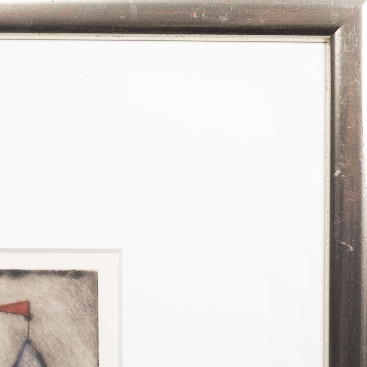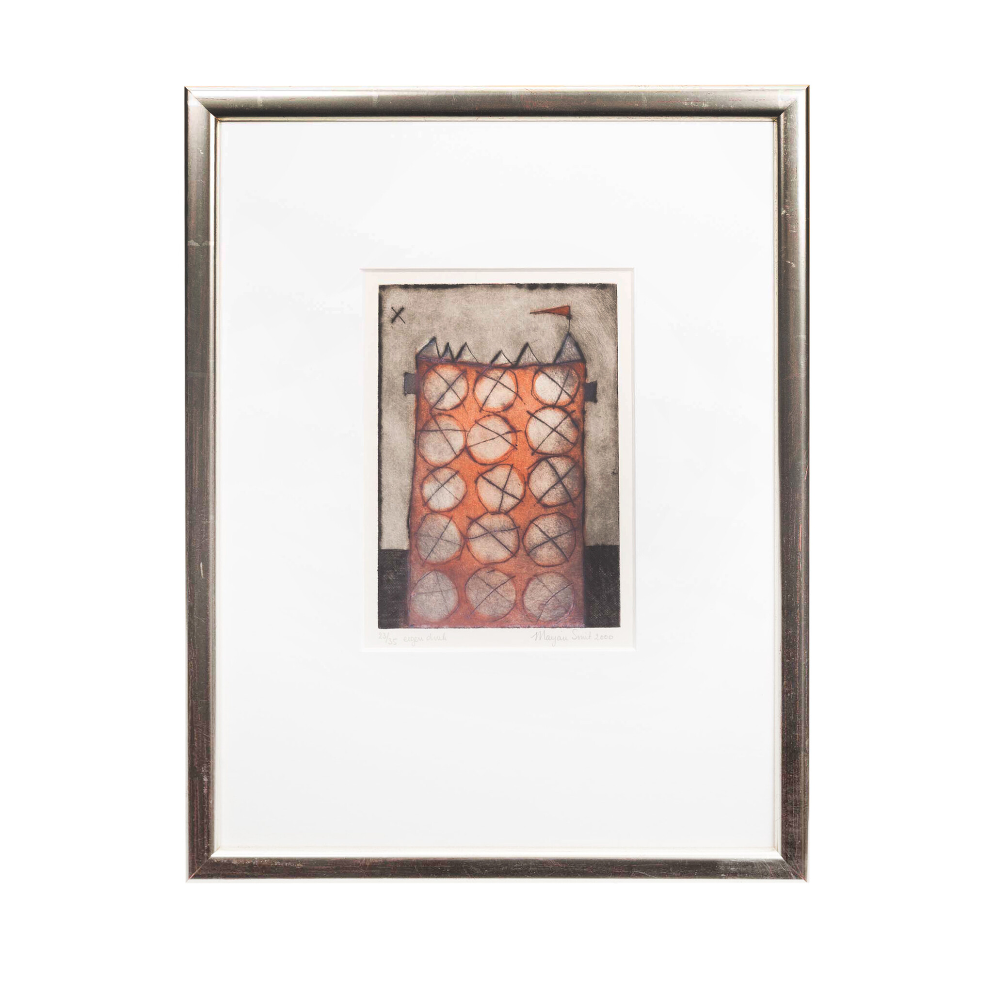 Marjan Smit, Kasteeltoren, 2000. Ets in metalen lijst oplage 23/35. Afbeelding van een rode toren met rood vlaggetje. Conditie: goed. De lijst heeft enkele lichte gebruikssporen. Afmeting lijst: 46 x 37 cm.