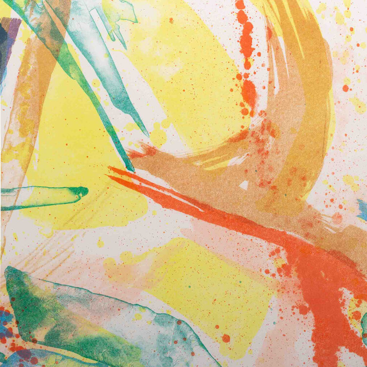 Marjel Beumer, Zonder titel, 1990. Lithografie, oplage 2/5. Kleurrijke abstracte compositie in o.a. rood, geel, blauw en paars. Signatuur rechtsonder. Conditie werk: Goed (++) Afmetingen lijst: 97 x 78 cm, beeldvlak 72,5 x 54,5 cm. Afmeting lijst: 93 x 72 cm; beeldvlak: 74 × 56 cm.