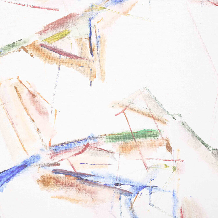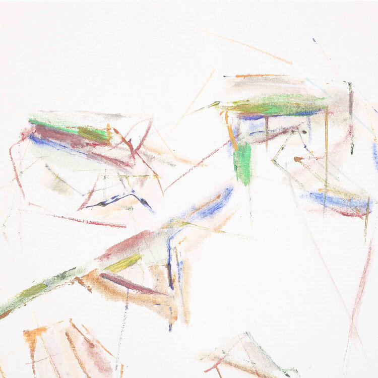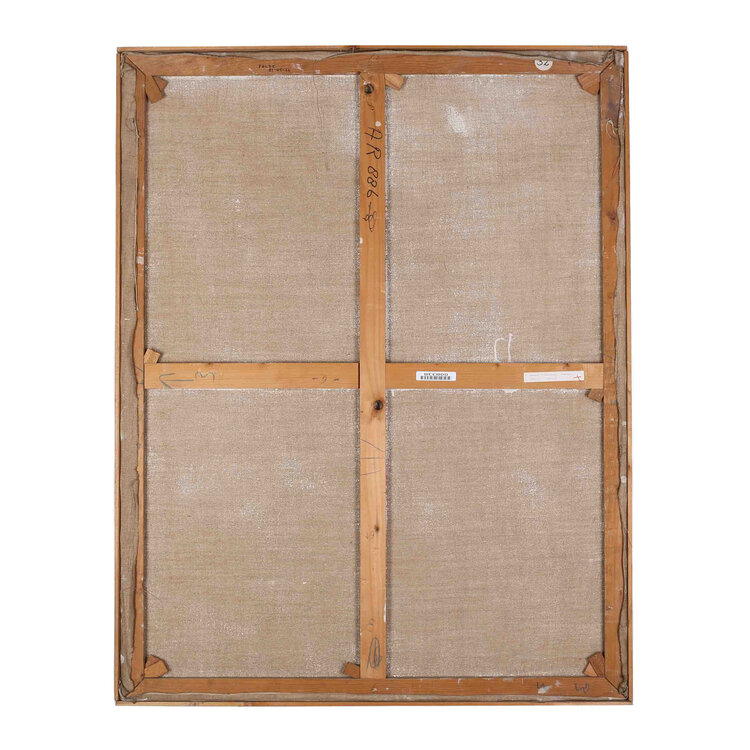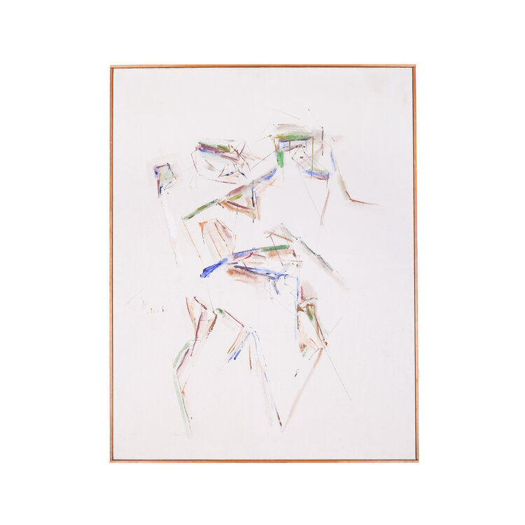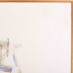Mark Polee, titel onbekend, 1980. Abstracte voorstelling van lijnen op witte linnen achtergrond. Afmetingen: 117 x 90,5 Conditie: Lijst toont sporen van gebruik. Het canvas is op verschillende plekken ingedeukt.