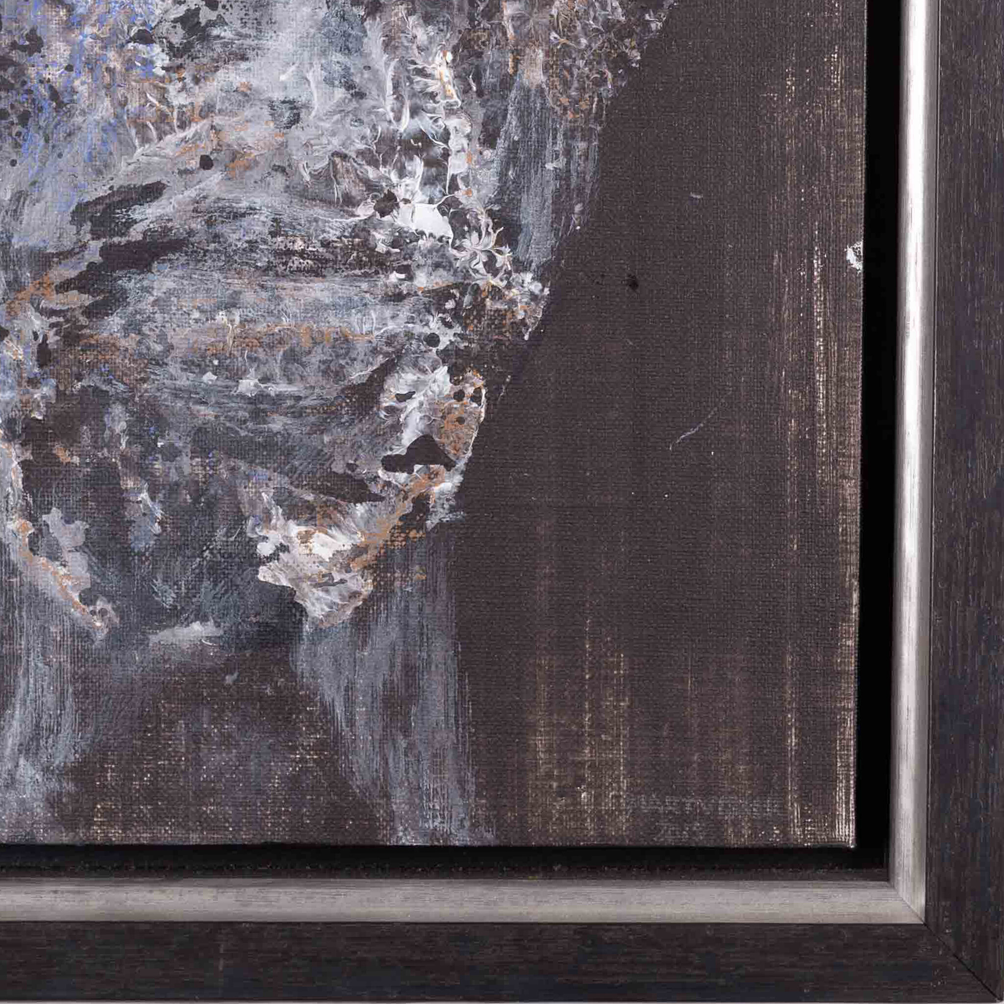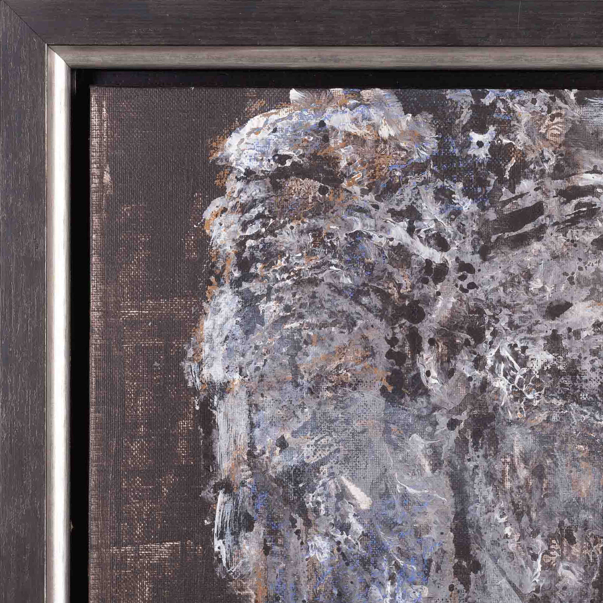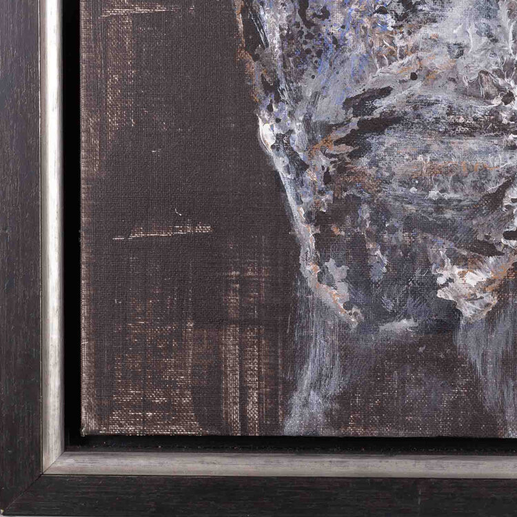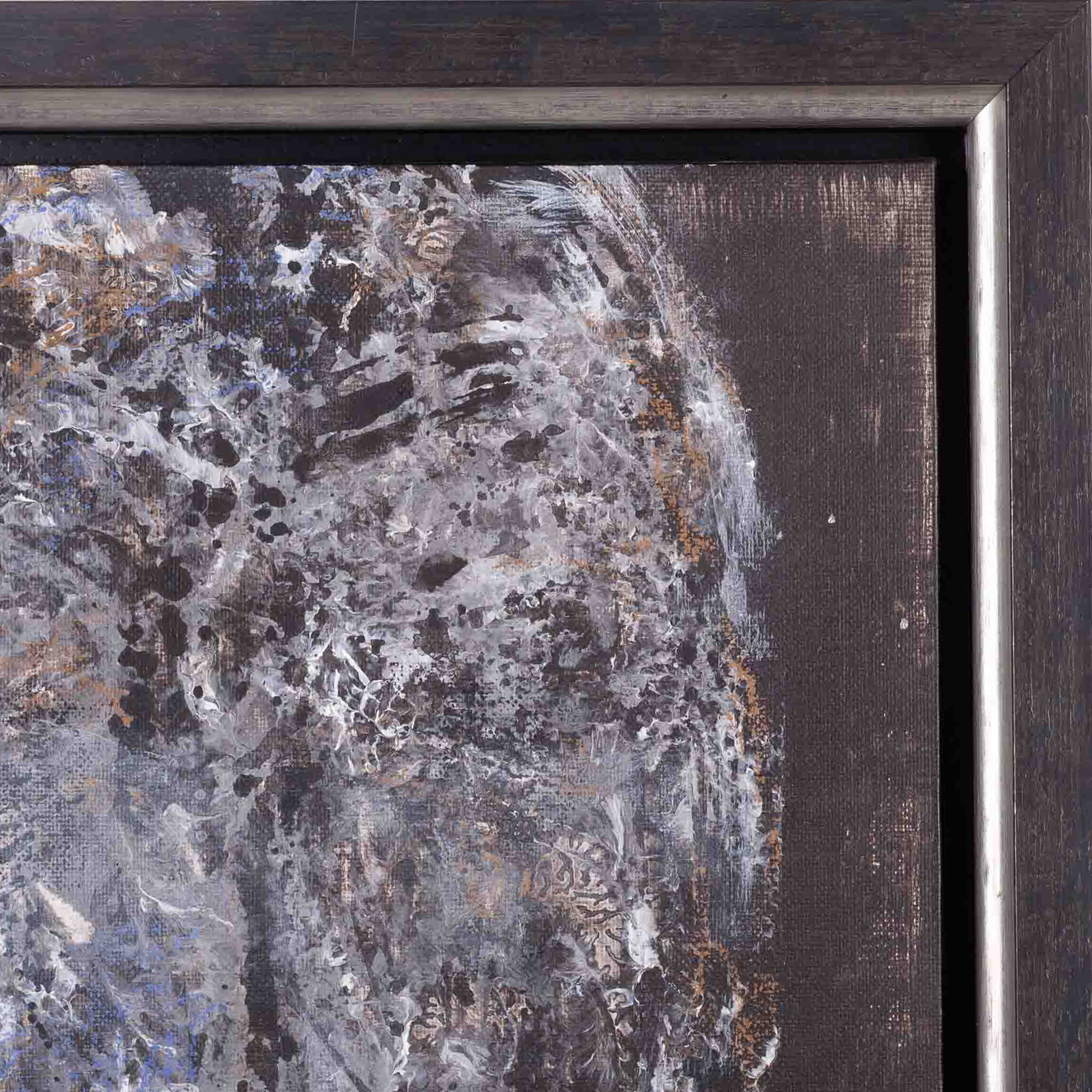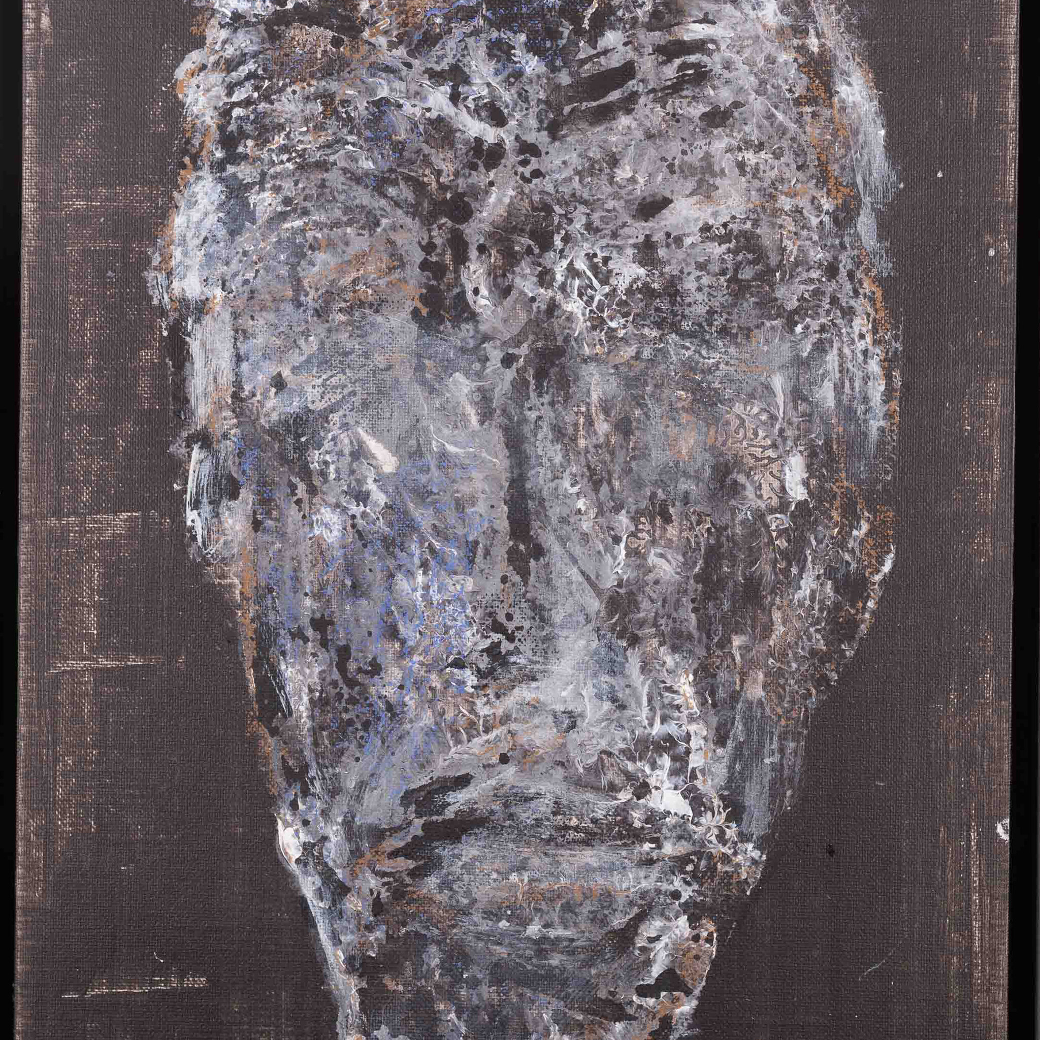 Mart Visser, 'Kop', 2015. Gemengde techniek op paneel in zwarte lijst. Een kop in grijs, bruin en blauw voor een donkere achtergrond. Rechtsonder signatuur en jaartal. Conditie: goed. Afmetingen incl lijst ca. 53,5 x 40 cm.