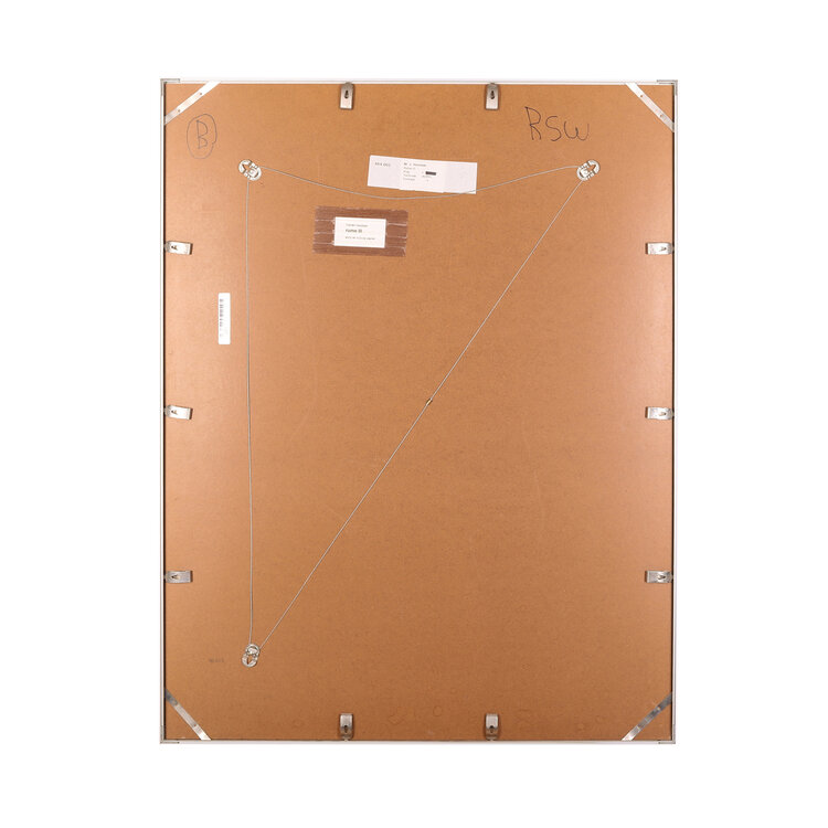 Marten Hazelaar, Rome III, jaartal onbekend. Acryl en krijt op papier in metalen lijst. Abstracte voorstelling van een donkerblauwe, grijze en oranje vorm voor een witte achtergrond. Conditie: gebruikssporen aan lijst. Afmeting werk zonder lijst: 67 x 48 cm.