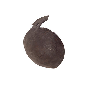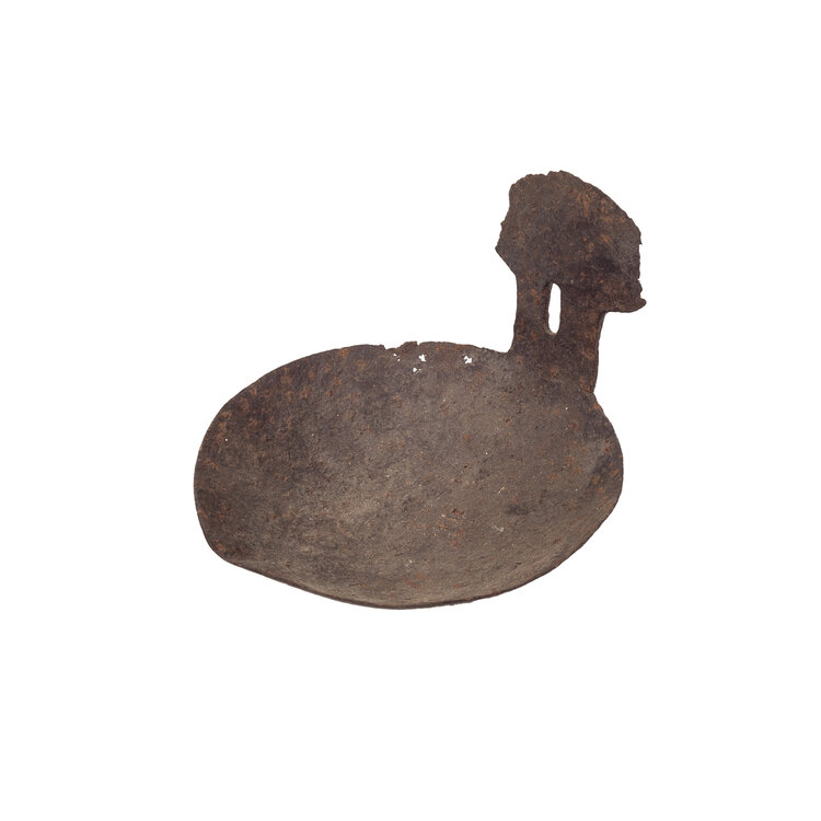 Fragment van een lepel of sleef. Aan het uiteinde loopt de lepel licht uit in een punt, aan de andere zijde is een verlengd stuk metaal met een gat waar de lepel vermoedelijk aan een handvat bevestigd was. Het gaat waarschijnlijk om een bodemvondst. Datering: onbekend. Conditie: duidelijk verweerd door de tijd en wat vuil. Afmetingen: ca. 9 x ø 13 cm.