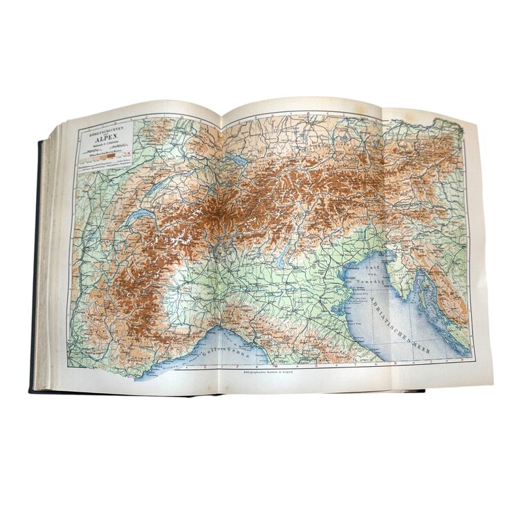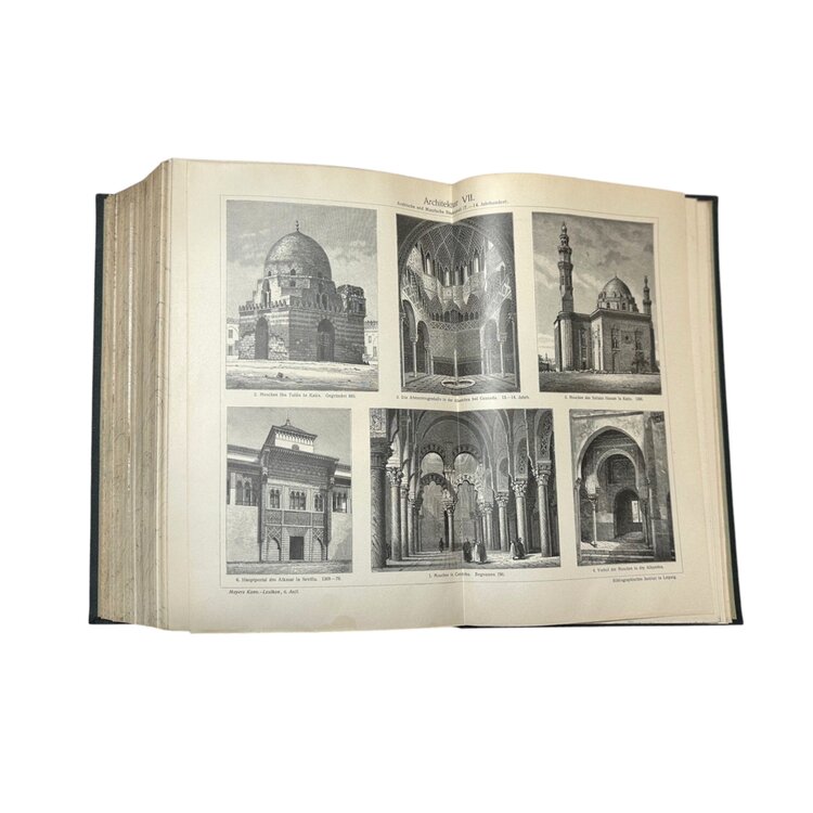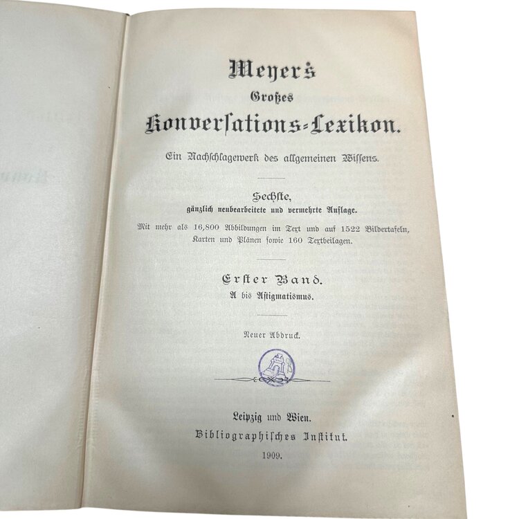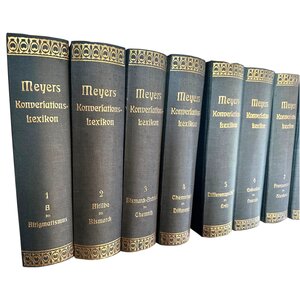 Meyers Konversations Lexikon Encyclopedie. Ein Nachschlagwerk des allgemeinen Wissens. Uitgegeven door Bibliographisches Institut Leipzig und Wien. Rijk geïllustreerd met kleurenkaarten (Farbtafeln). 24 delen waarvan 4 supplementen, zesde editie. Ingebonden in linnen groene kaft met gouden opdruk. Taal: Duits gotisch. Datering: 1909. Conditie: gebruikssporen passend bij de ouderdom. Afmetingen: 25,5 x 17 cm; rug 6,5 cm.