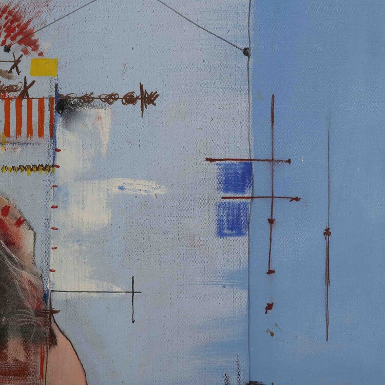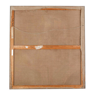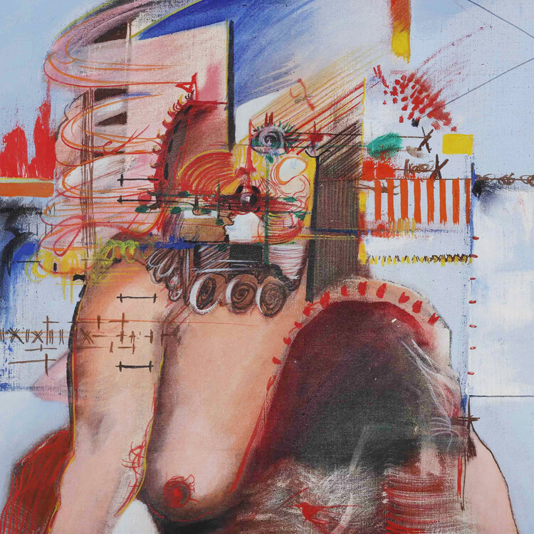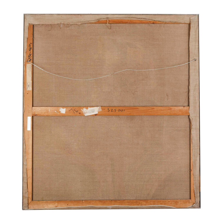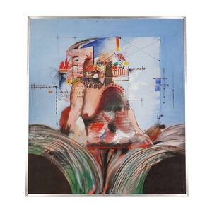 M.H. Sjardijn, Het gerecht, jaartal onbekend. Olieverf op doek met zilverkleurige lijst. Geabstraheerde voorstelling met vrouwelijk naakt en kleurrijk geometrische vormen en lijnen. Afmetingen: 102 x 91 cm. Conditie: Lijst toont sporen van gebruik.