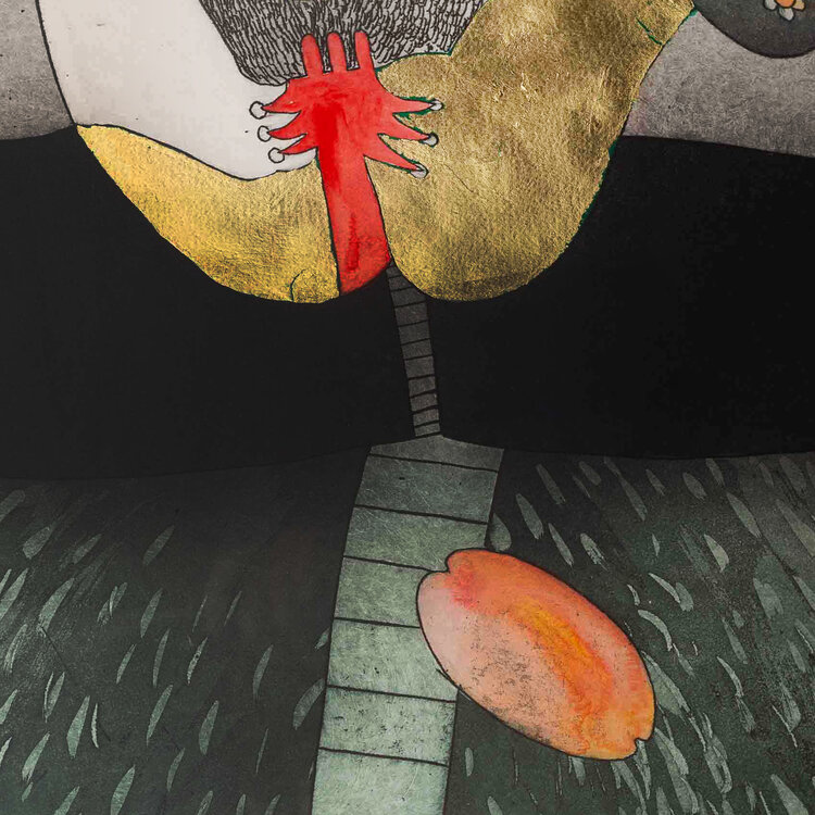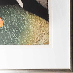 Michel van Overbeeke, 'Between us III', 1996. Kleurenets in zilverkleurige lijst, oplage, 11/50. Abstracte kleurrijke voorstelling met kleurvlakken in blauw, groen, zwart en bladgoud. Linksonder oplagenummer en titel, rechtsonder signatuur en jaar. Michel van Overbeeke (geb. 1942) is een Nederlandse kunstenaar die werkt in glaskunst, grafiek, keramiek en schilderkunst. Hij genoot zijn opleiding aan de Amsterdamsche Grafische School. Zijn vroege werk bestaat voornamelijk uit grafiek, tekeningen en schilderijen. Later breidde hij zijn kunde uit door monumentale kunstwerken in opdracht te vervaardigen in verschillende materialen. Onder andere het glas-in-loodraam in de Sint-Bavokerk te Haarlem en de kroonluchters in Paviljoen Welgelegen zijn van zijn hand. Van Overbeeke heeft geëxposeerd in onder andere het Frans Hals Museum, het Stedelijk Museum Zwolle en het Stedelijk Museum Kampen. Conditie: goed, lijst toont wat gebruikssporen. Afmeting: 73 x 87 cm.