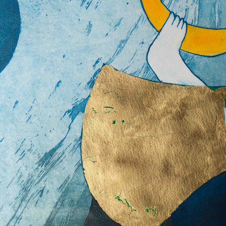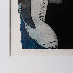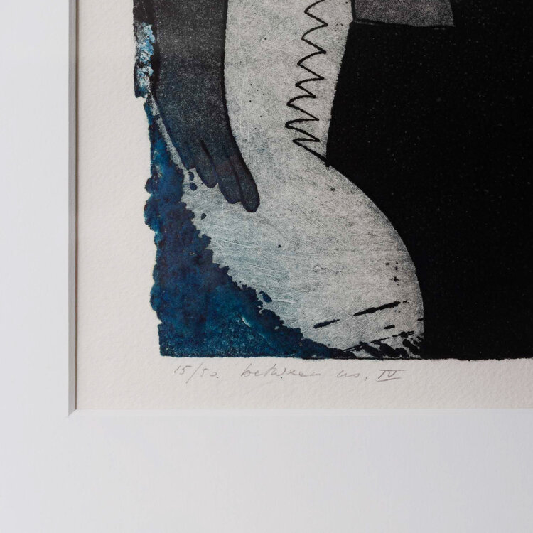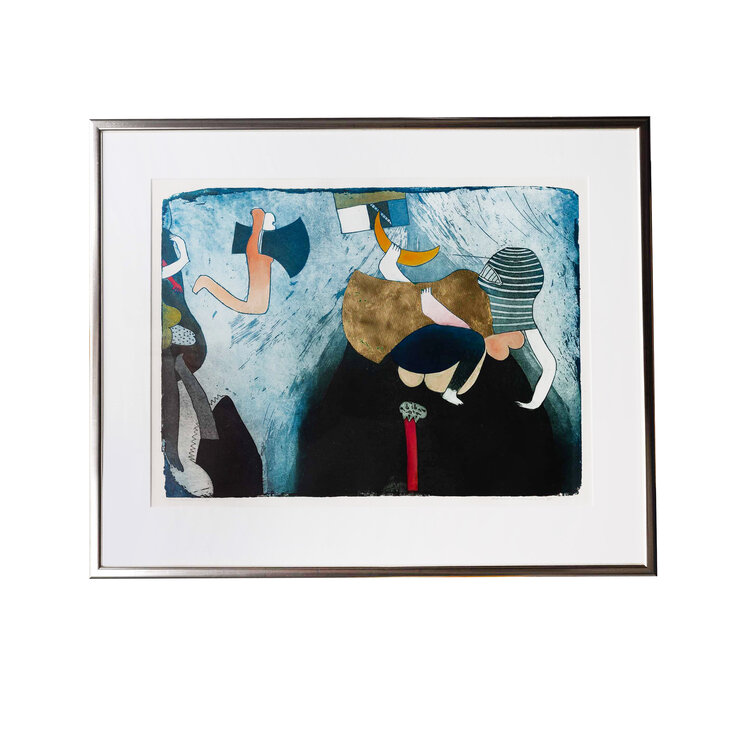 Michel van Overbeeke, 'Between us IV', 1996. Kleurenets in zilverkleurige lijst, oplage, 15/50. Abstracte kleurrijke voorstelling waarop armen en benen te herkennen zijn, in blauwtinten met kleurige accenten zoals rood, geel en bladgoud. Linksonder oplagenummer en titel, rechtsonder signatuur en jaar. Michel van Overbeeke (geb. 1942) is een Nederlandse kunstenaar die werkt in glaskunst, grafiek, keramiek en schilderkunst. Hij genoot zijn opleiding aan de Amsterdamsche Grafische School. Zijn vroege werk bestaat voornamelijk uit grafiek, tekeningen en schilderijen. Later breidde hij zijn kunde uit door monumentale kunstwerken in opdracht te vervaardigen in verschillende materialen. Onder andere het glas-in-loodraam in de Sint-Bavokerk te Haarlem en de kroonluchters in Paviljoen Welgelegen zijn van zijn hand. Van Overbeeke heeft geëxposeerd in onder andere het Frans Hals Museum, het Stedelijk Museum Zwolle en het Stedelijk Museum Kampen. Conditie: goed, lijst toont wat gebruikssporen. Afmeting: 73 x 87 cm.