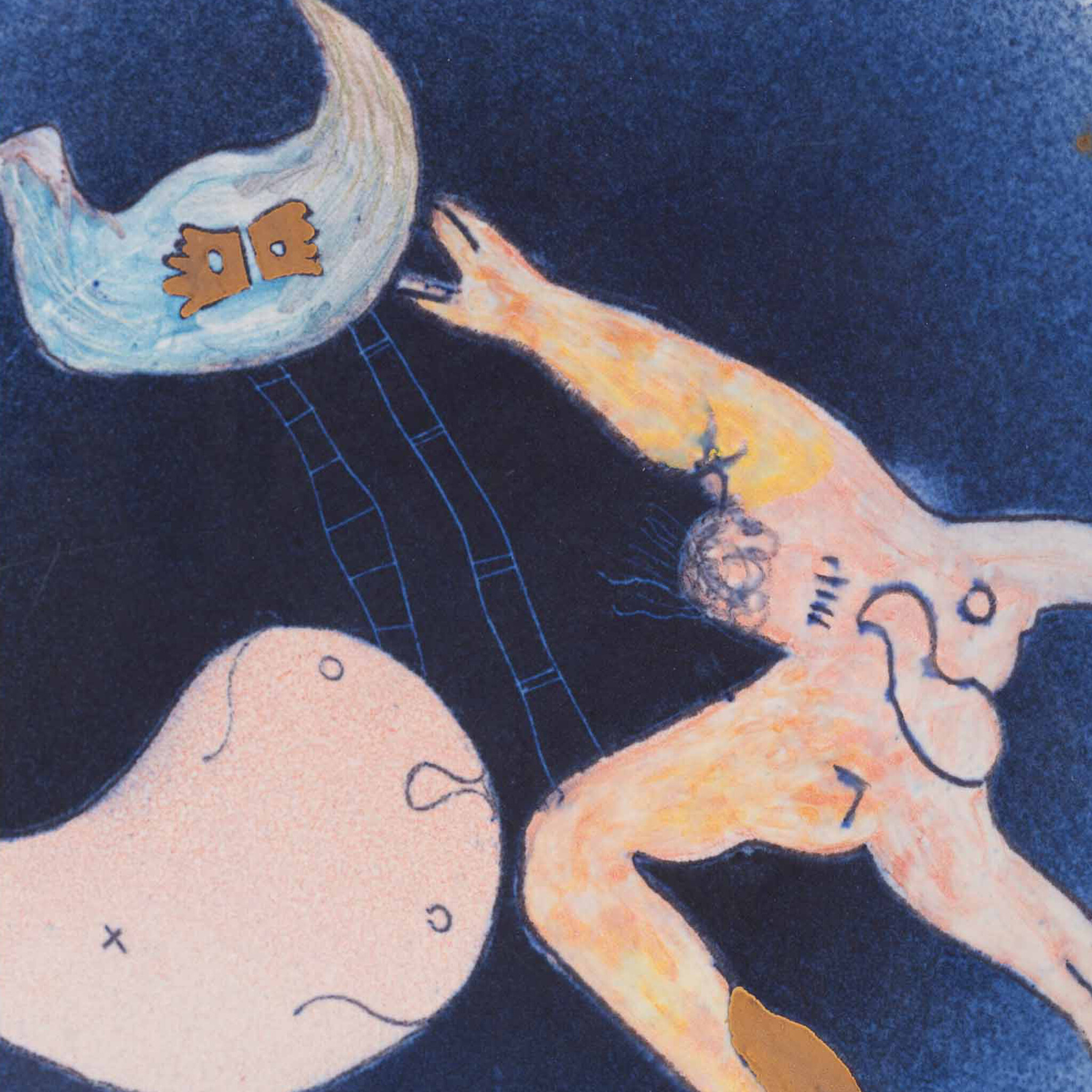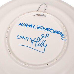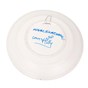 Michel van Overbeeke, 'Keramische schaal', 1998. Blauwe schaal met figuur en vormen in roze en lichtblauw met gouden details. Aan de onderkant is een haak bevestigd zodat de schaal opgehangen kan worden. Signatuur op onderkant. Michel van Overbeeke (geb. 1942) is een Nederlandse kunstenaar die werkt in glaskunst, grafiek, keramiek en schilderkunst. Hij genoot zijn opleiding aan de Amsterdamsche Grafische School. Zijn vroege werk bestaat voornamelijk uit grafiek, tekeningen en schilderijen. Later breidde hij zijn kunde uit door monumentale kunstwerken in opdracht te vervaardigen in verschillende materialen. Onder andere het glas-in-loodraam in de Sint-Bavokerk te Haarlem en de kroonluchters in Paviljoen Welgelegen zijn van zijn hand. Van Overbeeke heeft geëxposeerd in onder andere het Frans Hals Museum, het Stedelijk Museum Zwolle en het Stedelijk Museum Kampen. Conditie: vertoont gebruikssporen; kleine beschadigingen, zoals butsen en krassen. Afmeting: hoog 4,5 cm, Ø 39 cm.
