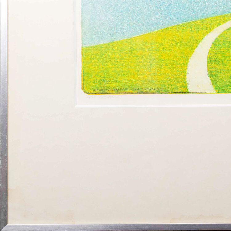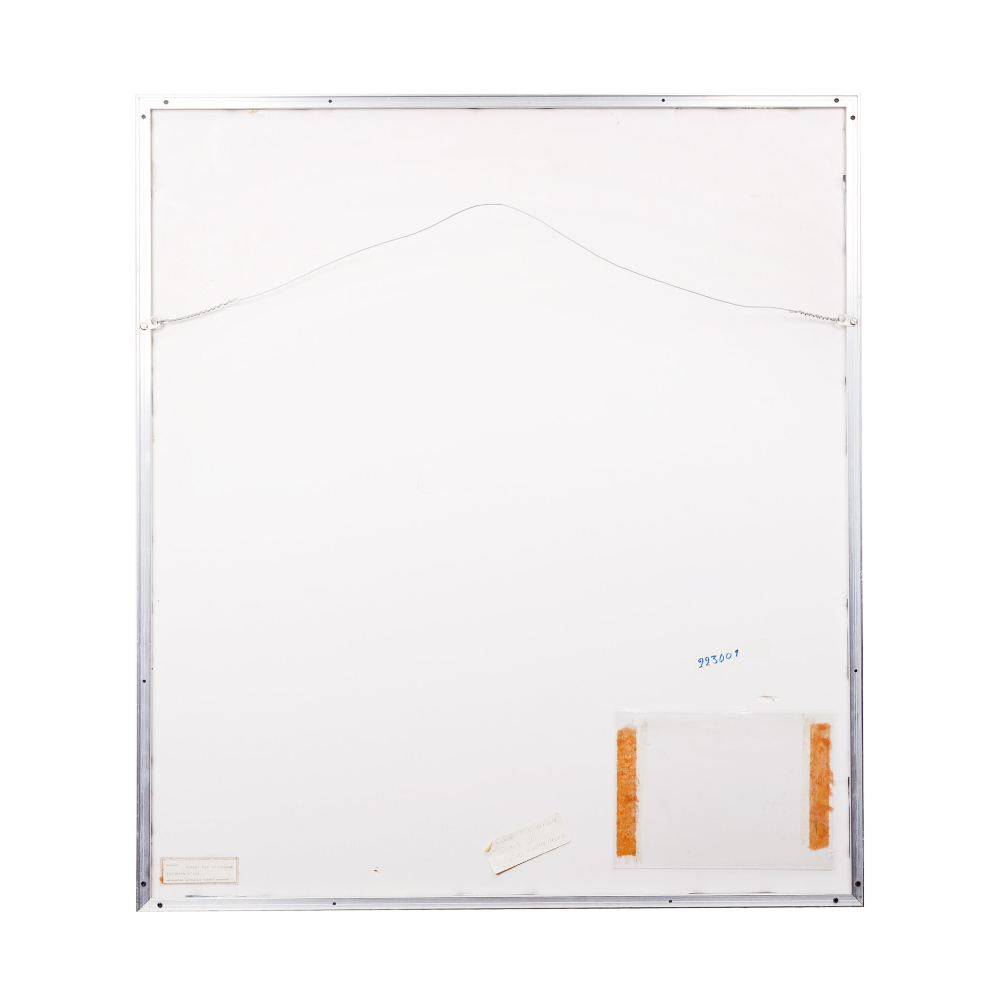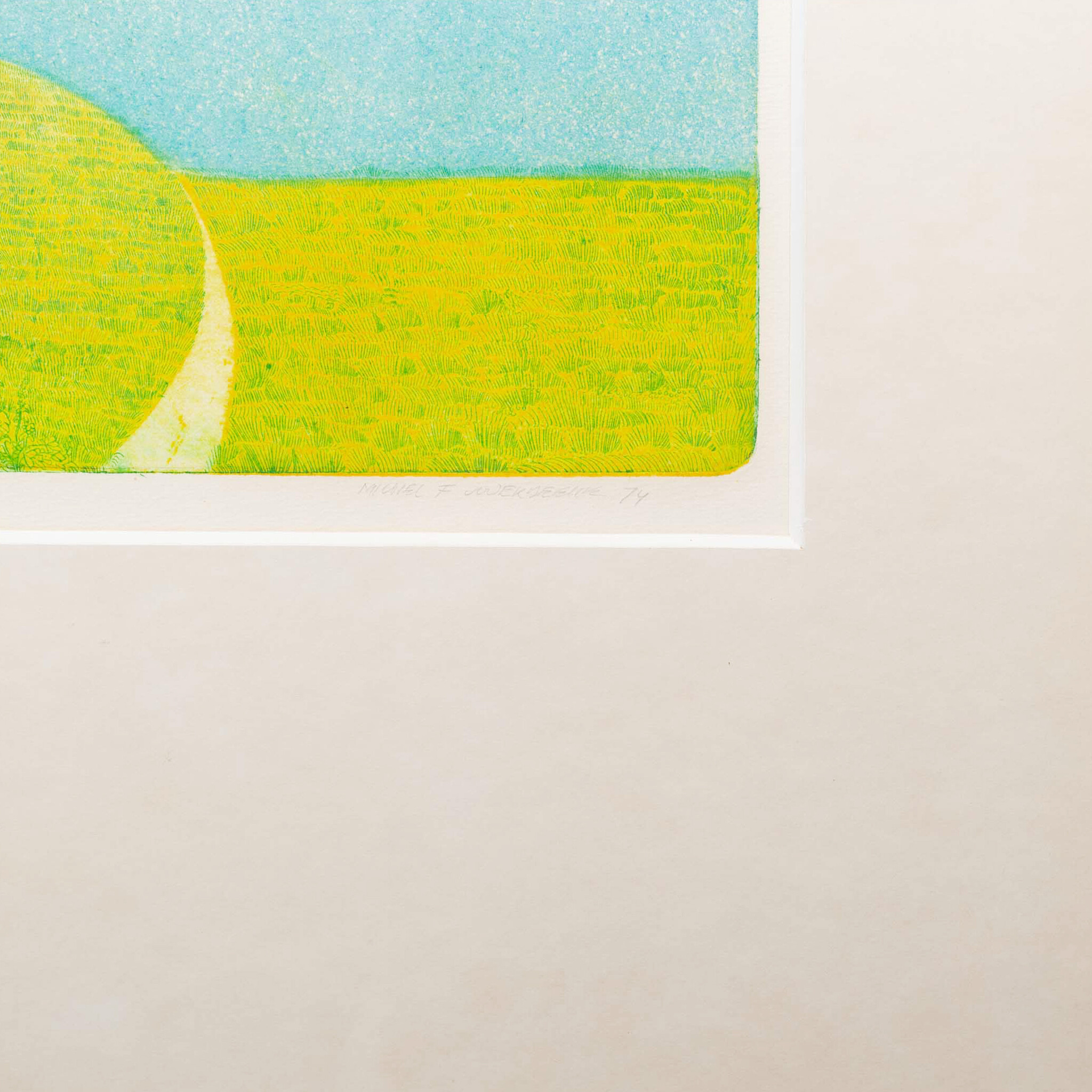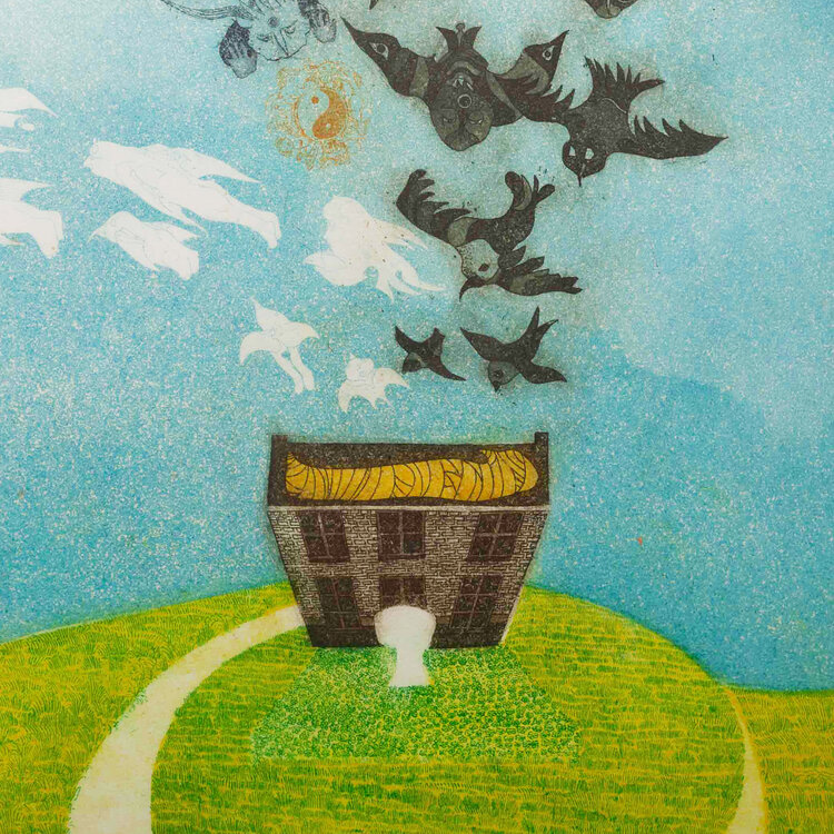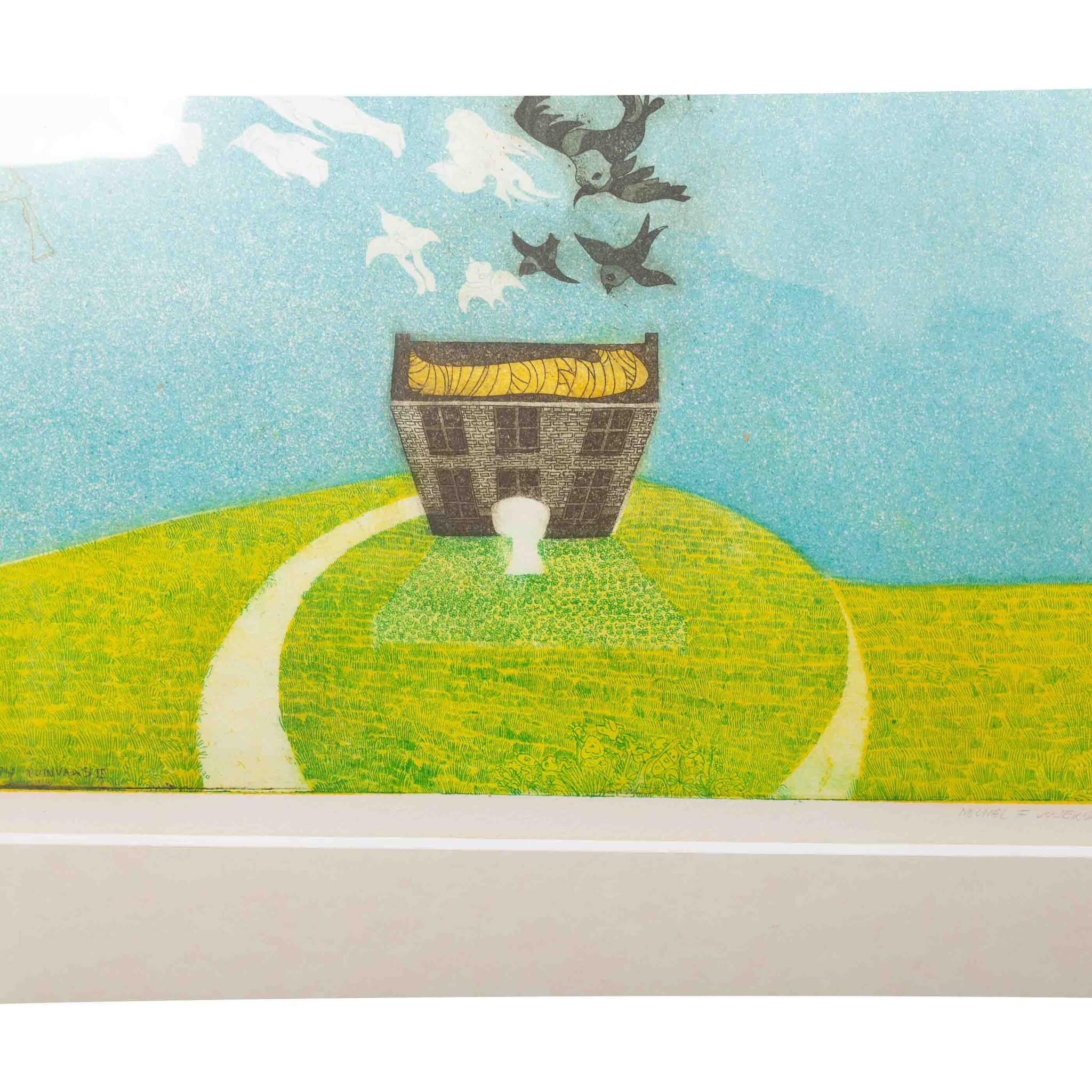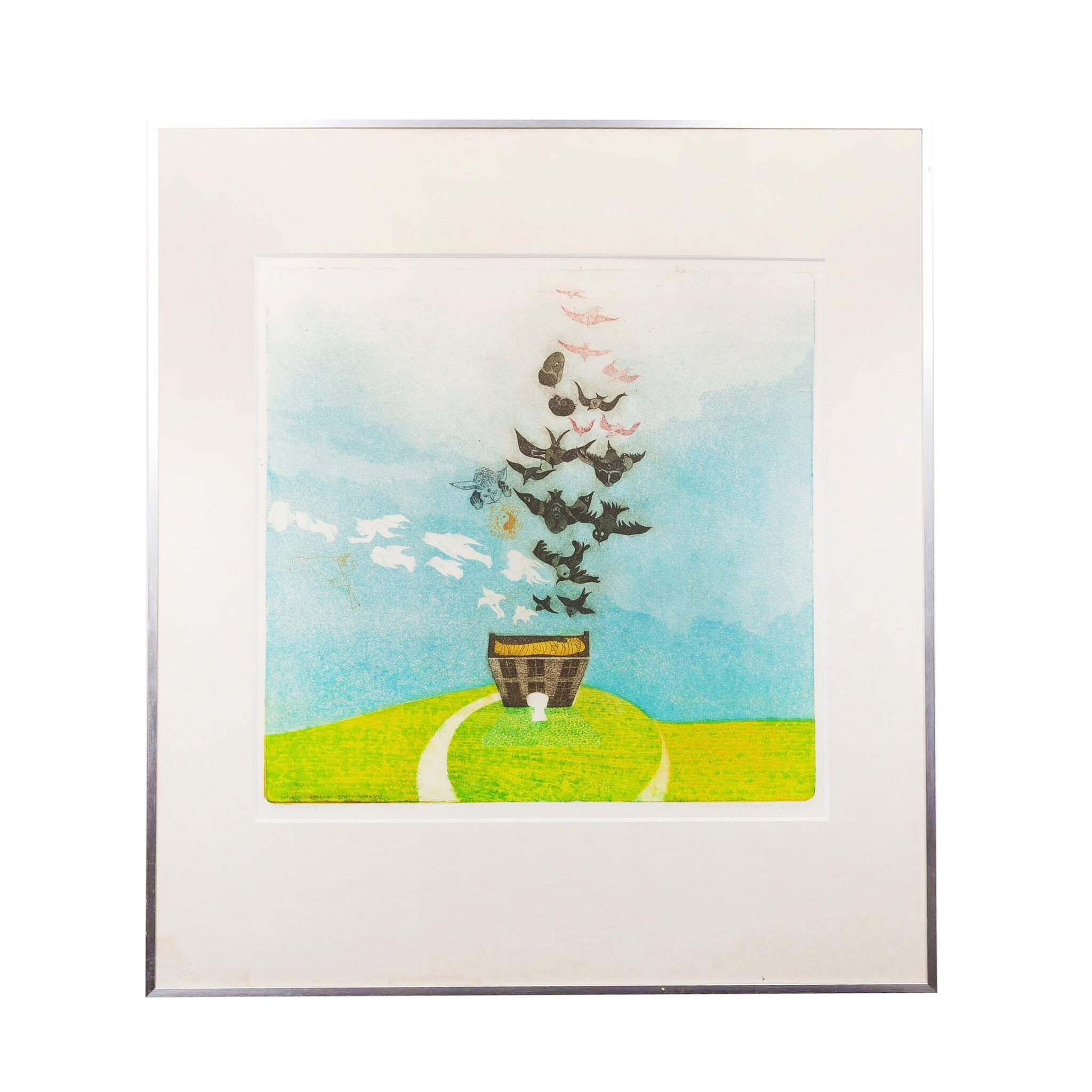 Michel van Overbeeke, 'Tuinvaas 2', 1974. Ets in zilverkleurige lijst, oplage 16/25. Kleurrijke compositie met een mummie op het dak van een huis, waar zwarte en rode gevleugde figuren naartoe vliegen en witte figuren uit vliegen. Signatuur rechtsonder. Conditie: hier en daar foxing vlekjes op het werk en de lijst toont gebruikssporen, aan de achterzijde een paar deuken. Afmeting lijst: 81 x 70,5 cm, beeldvlak: 49 x 49 cm.