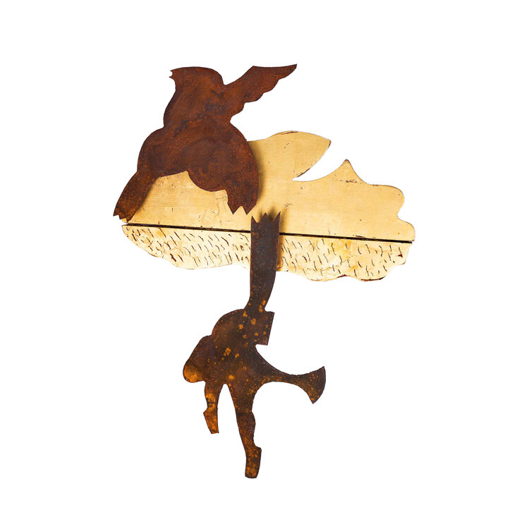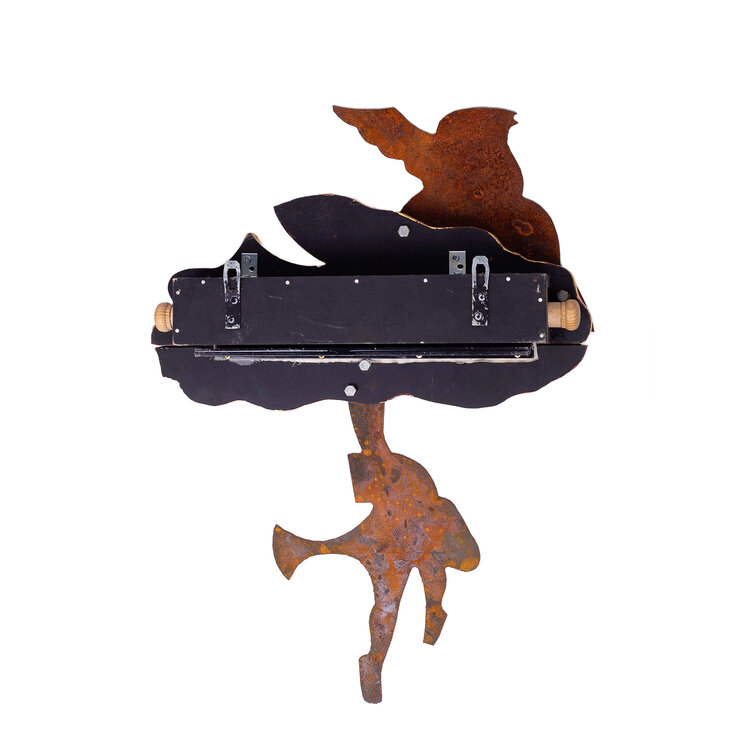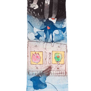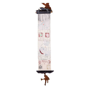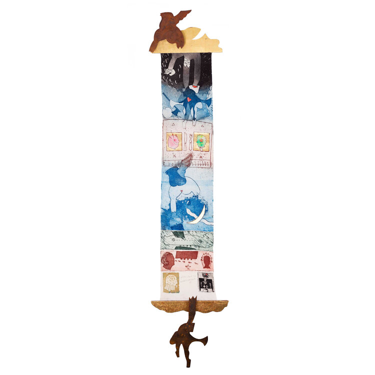 Michel van Overbeeke, Golden Cloud, 1998. Kleurenets op doek in houten opbergdoos met daarop twee metalen figuren, gemaakt in een oplage van 60. Op de scroll is een abstracte kleurrijke voorstelling aangebracht waar de kunstenaar met de hand details in bladgoud op heeft gemaakt. Onderaan is het werk gesigneerd. De scroll zit opgerold in een houten met bladgoud bekleed kistje, met aan de achterzijde twee metalen ophang haakjes. Het kistje wordt gesloten met een magneet. Conditie: de scroll is in goede conditie, het kistje toont hier en daar gebruikssporen. Afmetingen ca.: uitgerolde scroll 195 x 41 x 10 cm; opbergkist: 56 x 41 x 10 cm.
